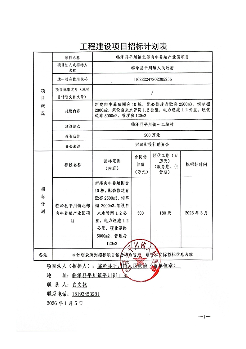 临泽县平川镇北部肉牛养殖产业园项目招标计划