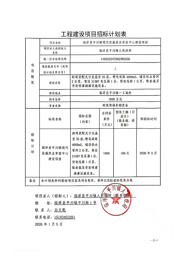 临泽县平川镇现代设施农业育苗中心建设项目招标计划