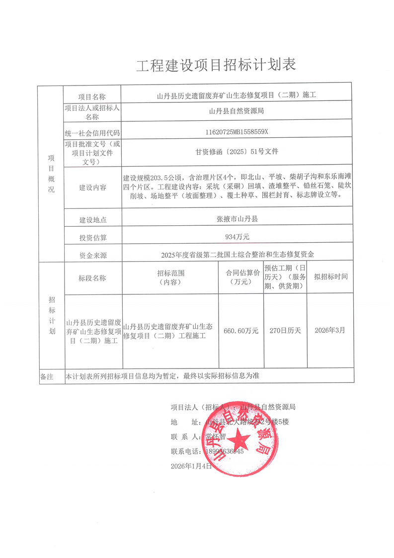 山丹县历史遗留废弃矿山生态修复项目(二期)施工招标计划