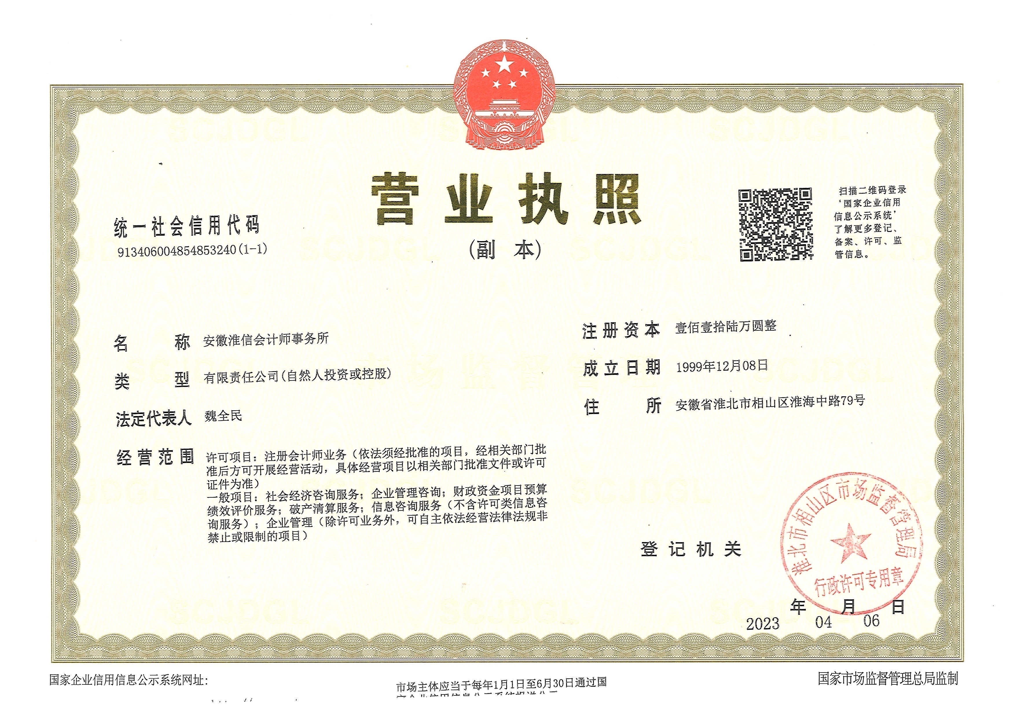 营业执照等证明文件:****年新安徽淮信会计师事务所营业执照.***