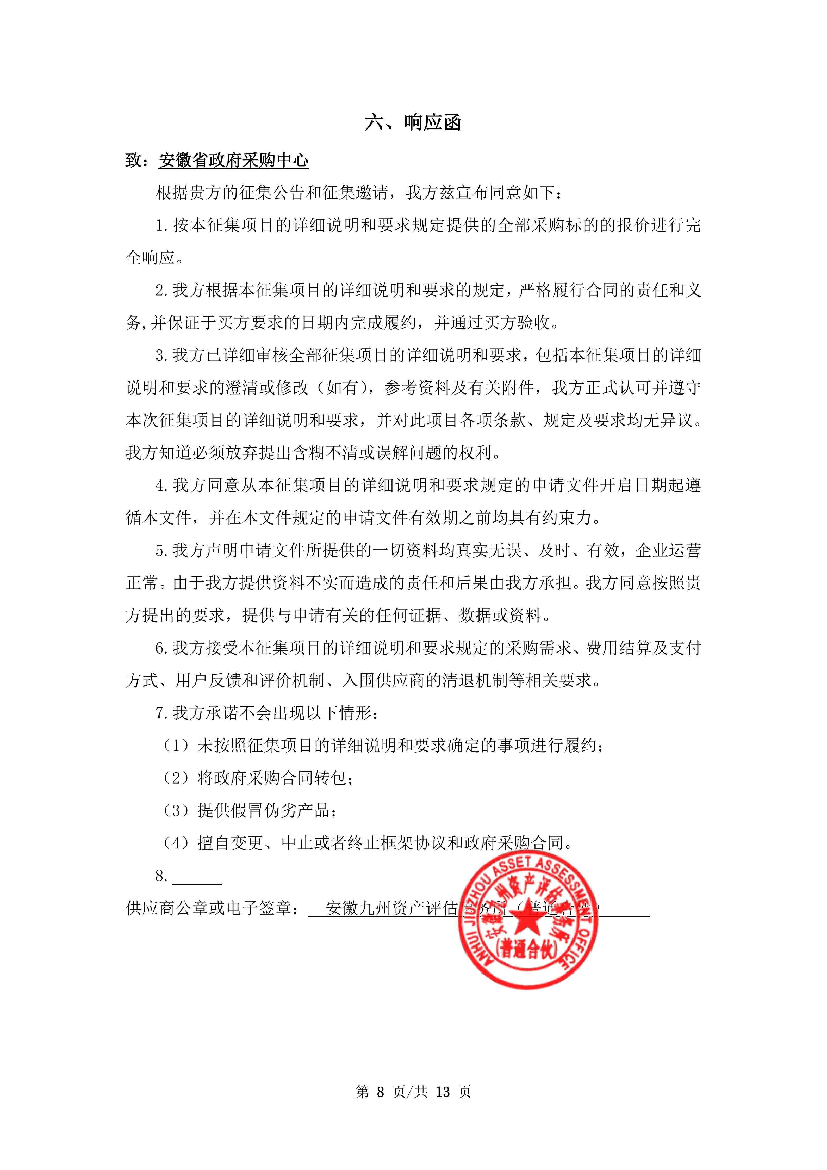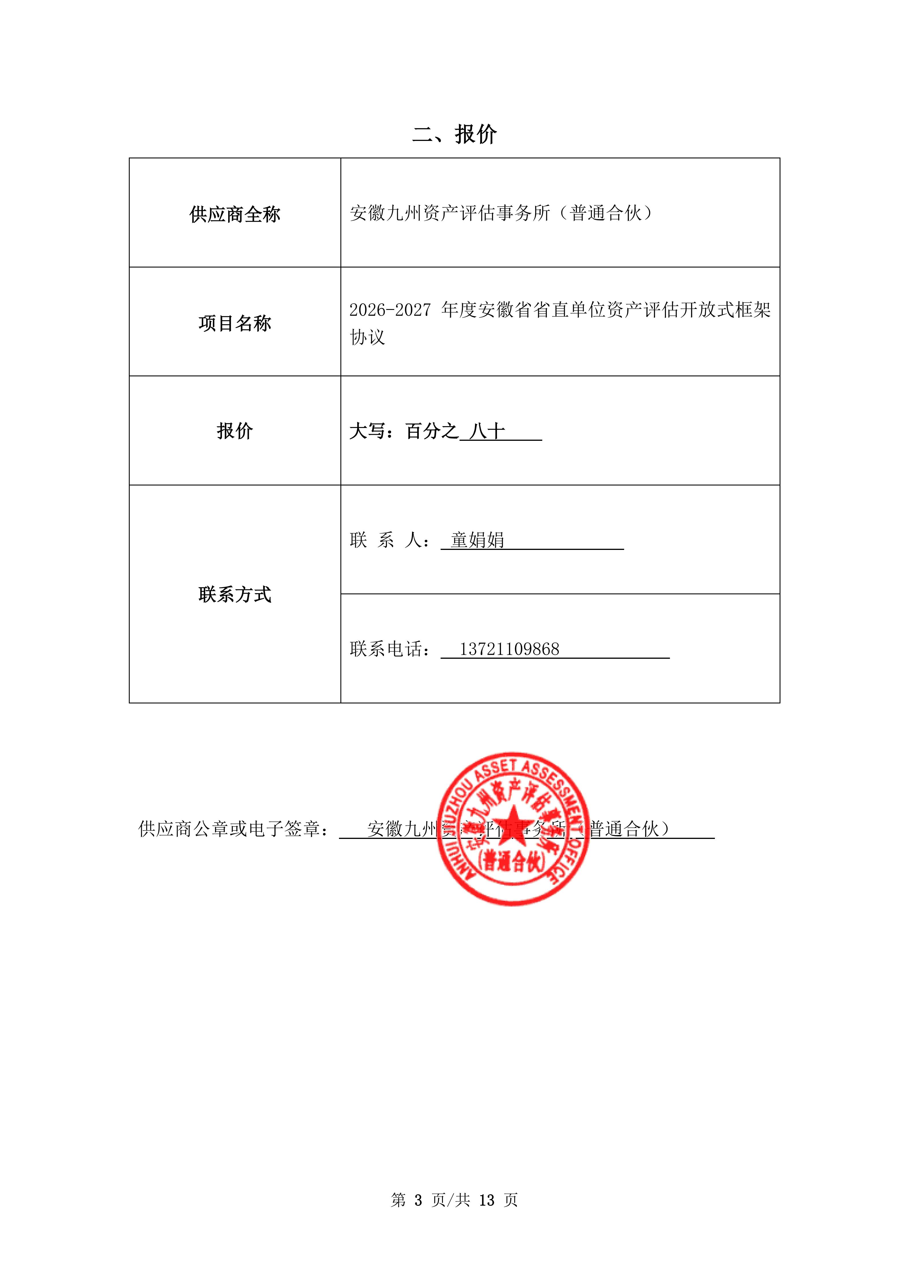 安徽九州资产评估事务所(普通合伙)*********年度安徽省省直单位资产评估开放式框架协议