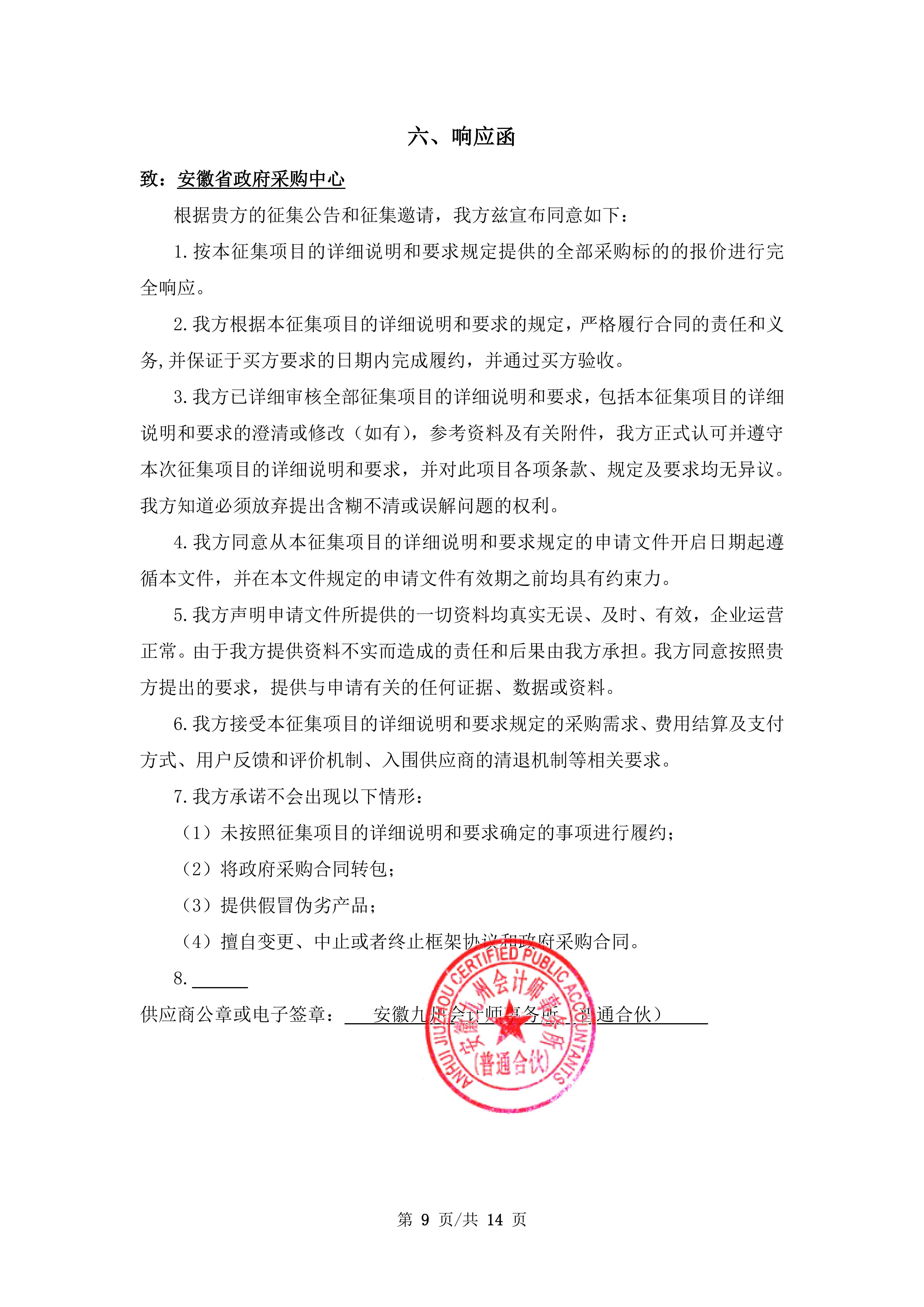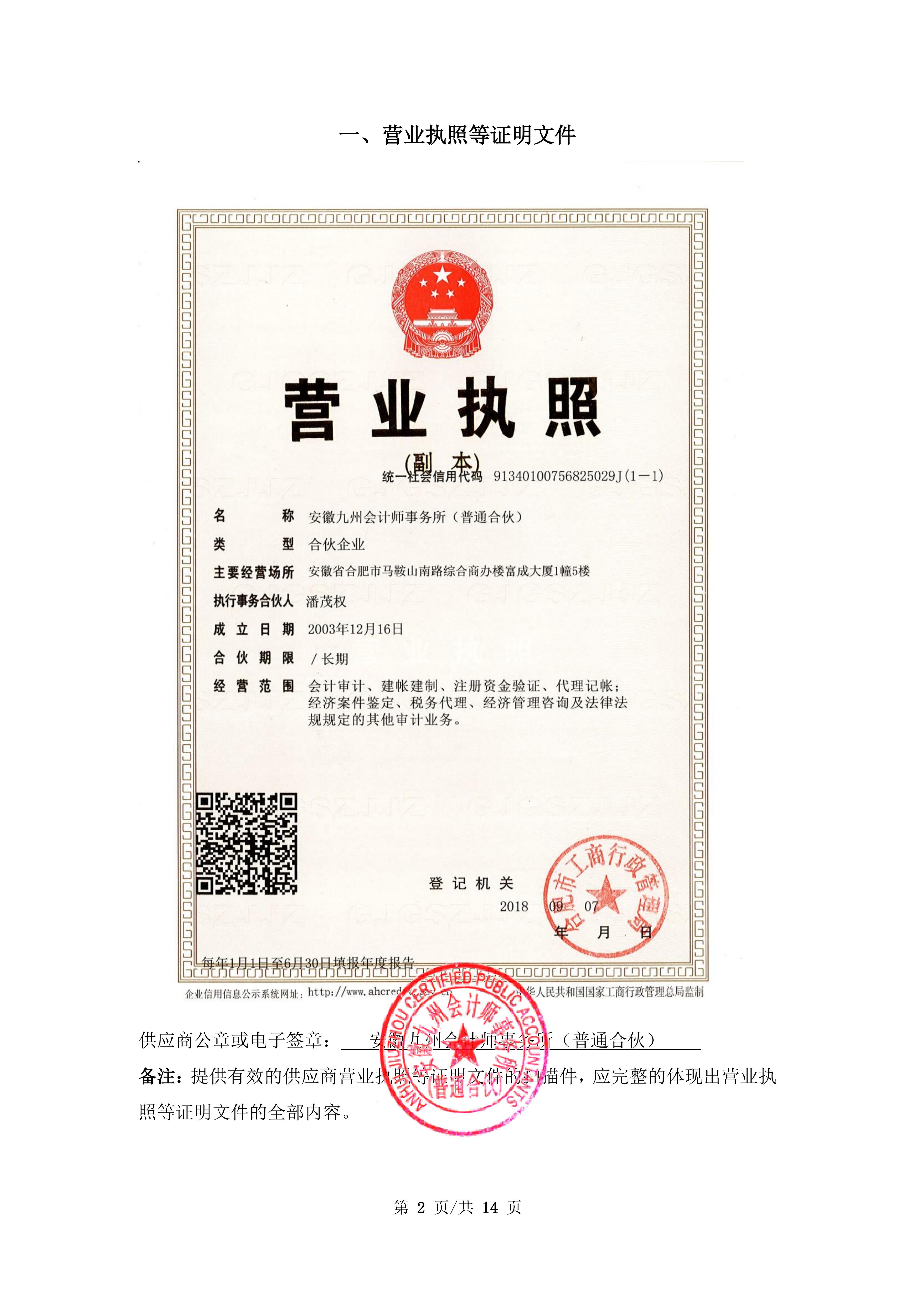 *********年度安徽省省直单位财务审计开放式框架协议 安徽九州会计师事务所(普通合伙)*********年度安徽省省直单位财务审计开放式框架协议 营业执照等证明文件:*.营业执照.***