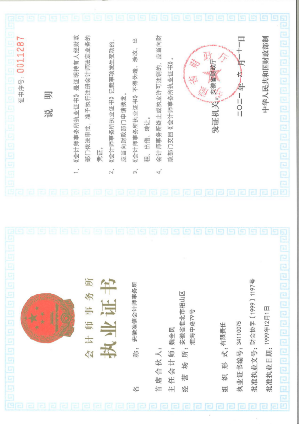 资质:安徽淮信会计所执业证书.***