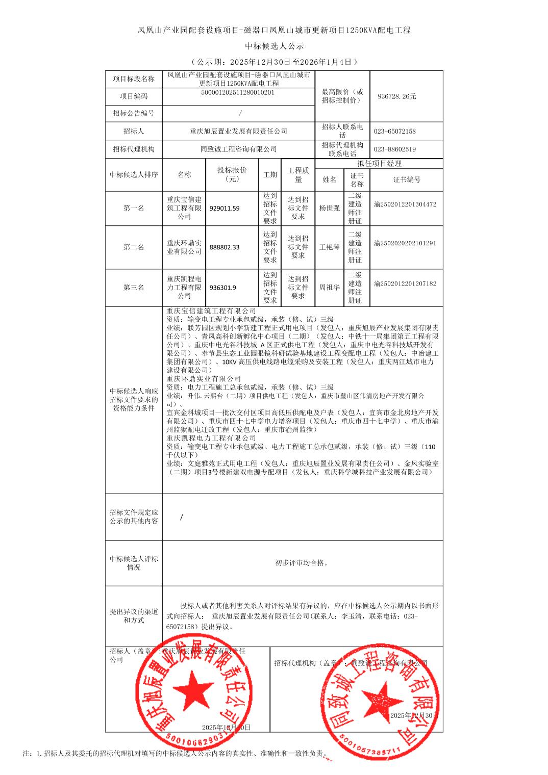 凤凰山产业园配套设施项目-磁器口凤凰山城市更新项目1250KVA配电工程中标候选人公示