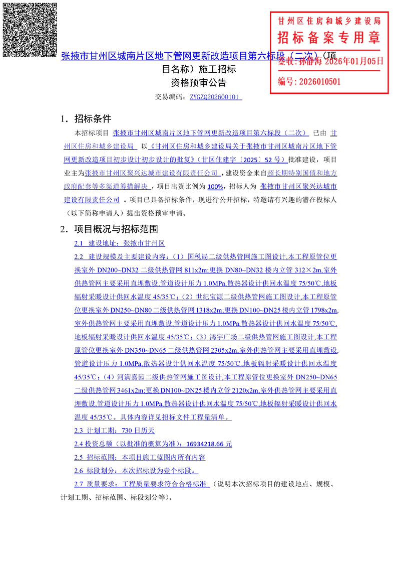 张掖市甘州区城南片区地下管网更新改造项目第六标段(二次)招标/资审公告