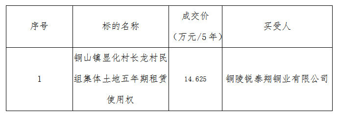 【中标(成交)公示】铜山镇显化村长龙村民组集体土地(约**亩)五年期租赁使用权成交结果公示
