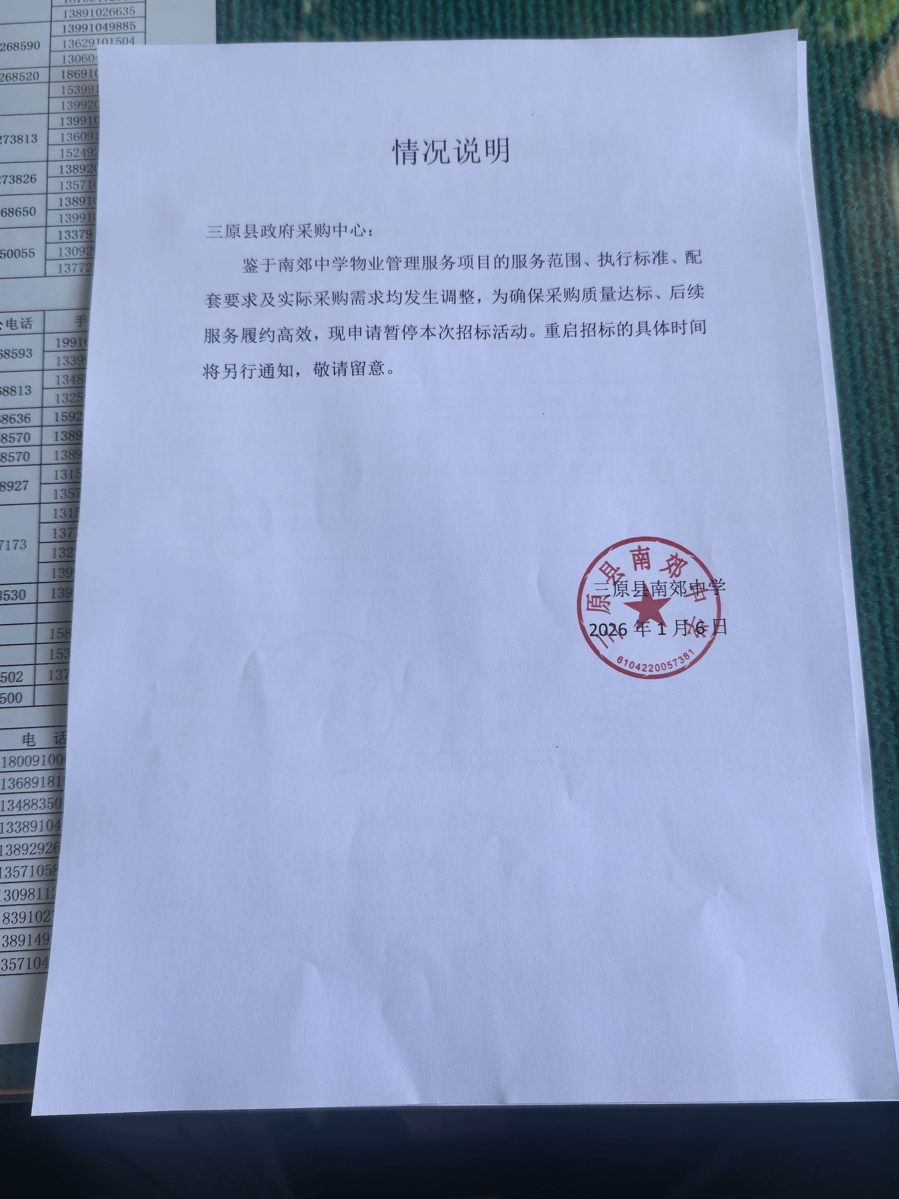 三原县南郊中学南郊中学物业管理服务项目采购更正公告(第一次)