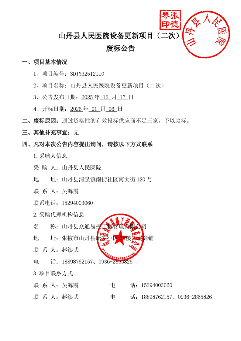 山丹县人民医院设备更新项目(二次)废标公告{type}
