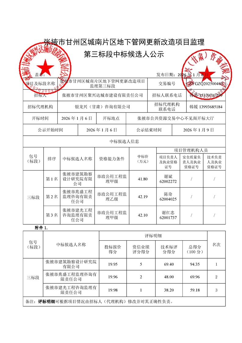[市本级]张掖市甘州区城南片区地下管网更新改造项目监理第三标段中标候选人公示交易结果公示