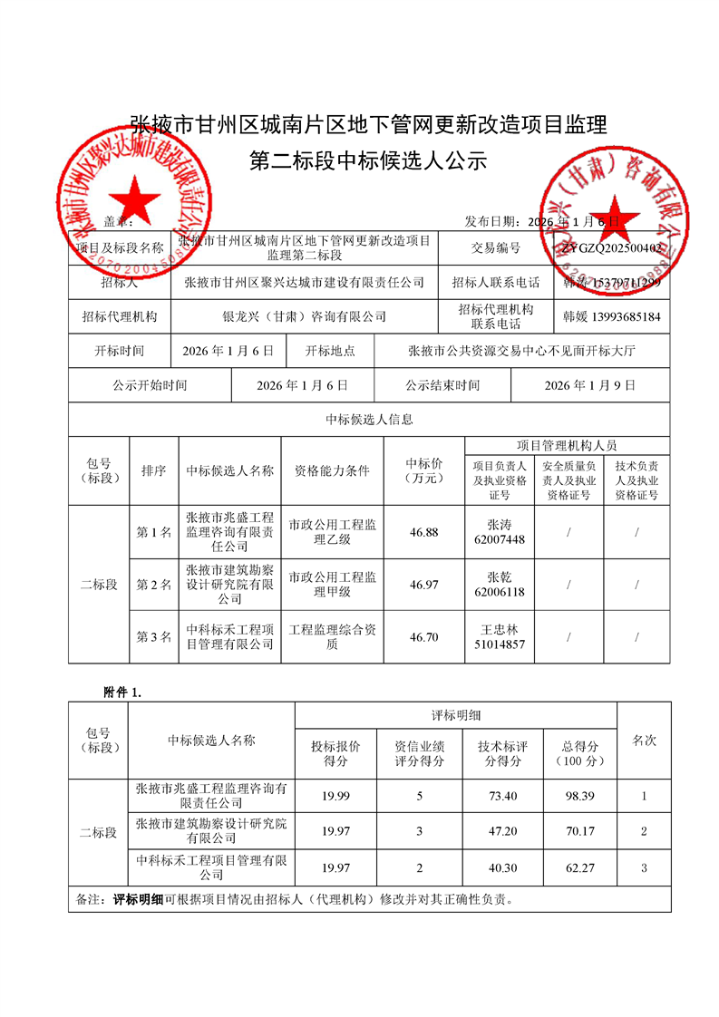 [市本级]张掖市甘州区城南片区地下管网更新改造项目监理第二标段中标候选人公示交易结果公示