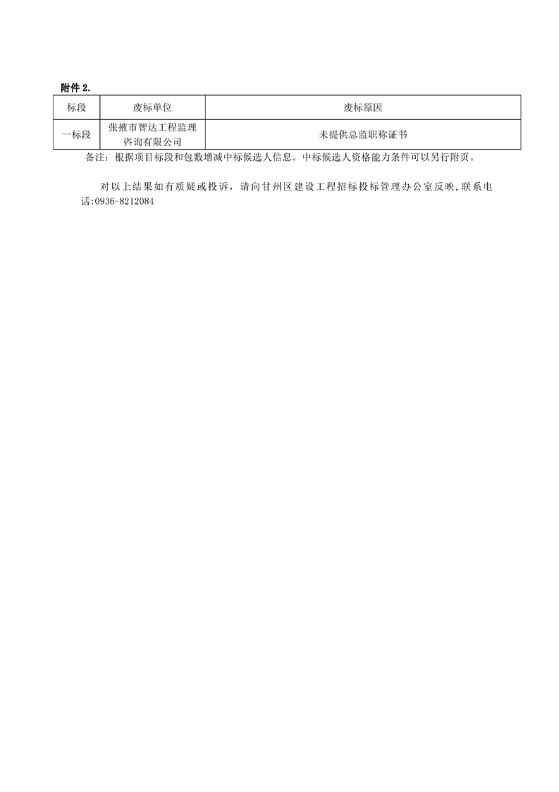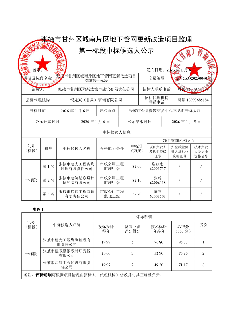 [市本级]张掖市甘州区城南片区地下管网更新改造项目监理第一标段中标候选人公示交易结果公示