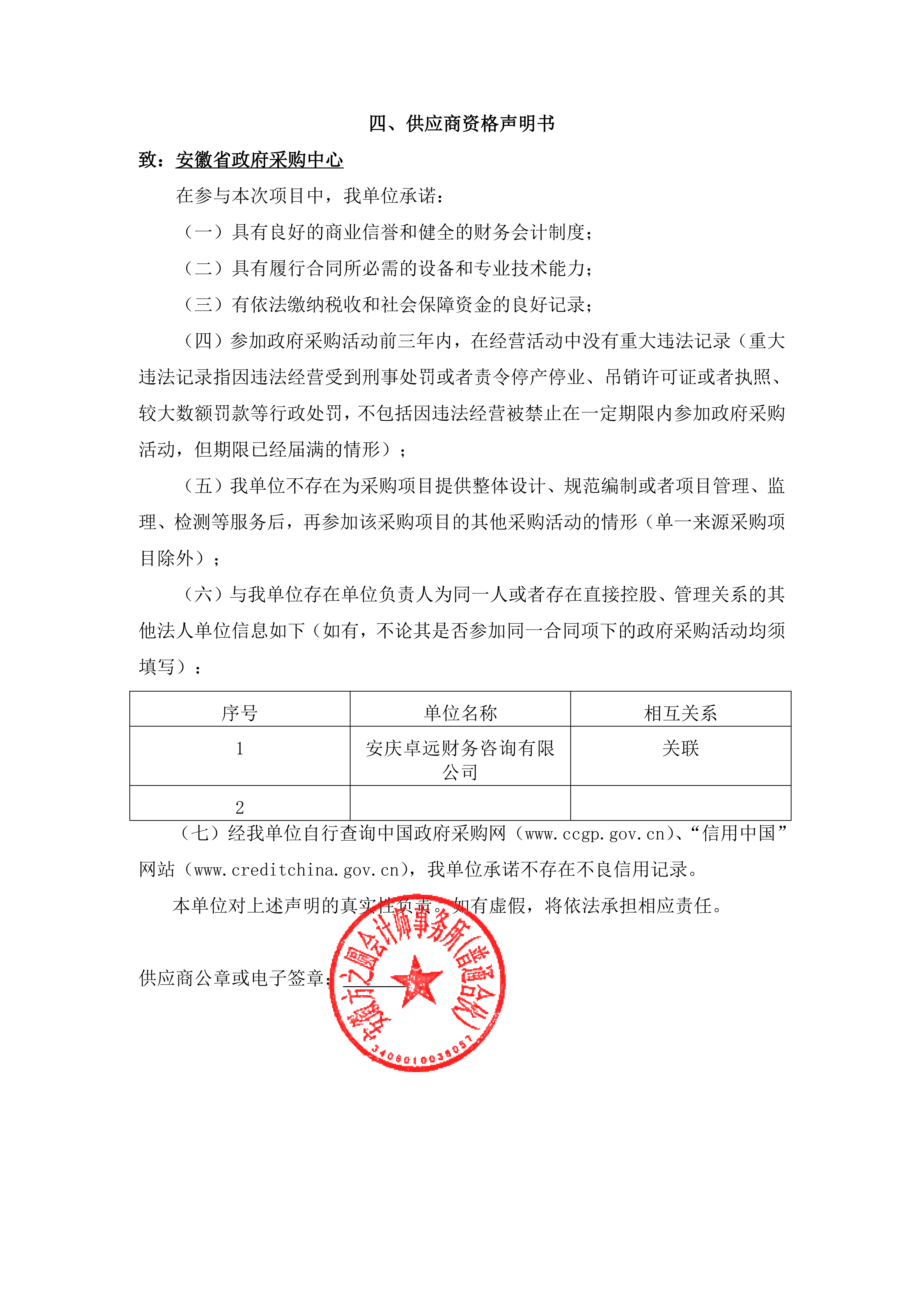 供应商资格声明书:*****省直财务审计框架协议 申请文件(*)***.***
