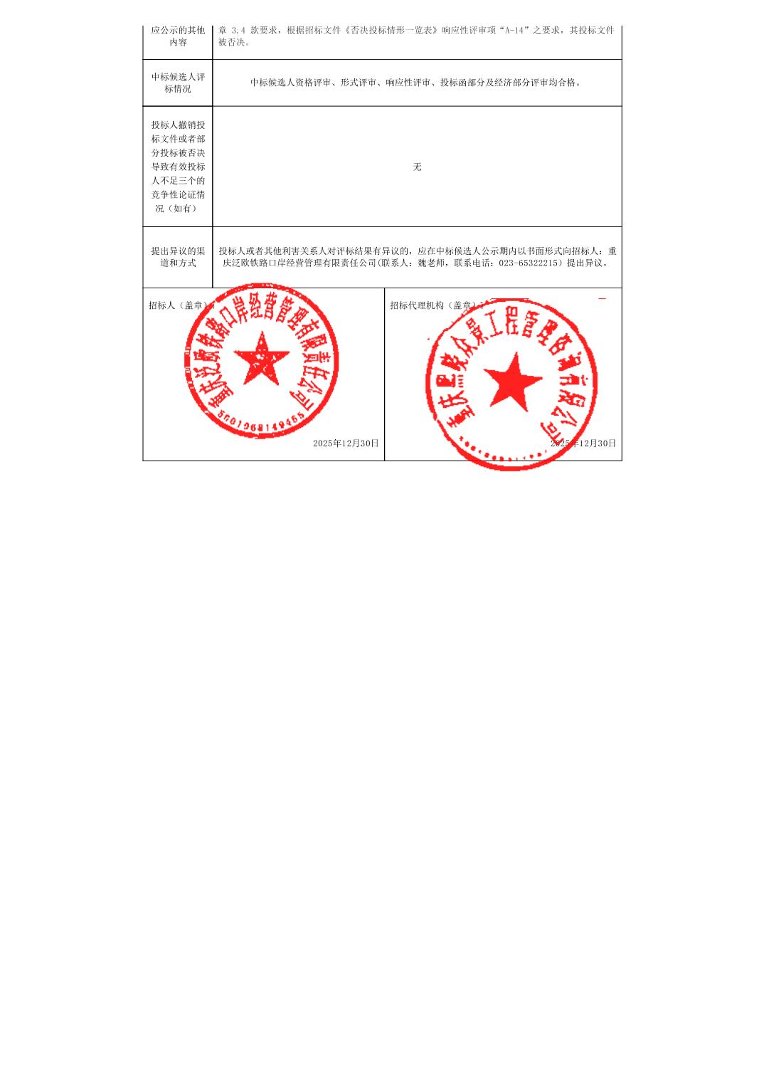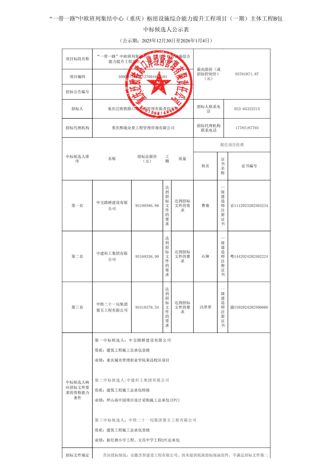 “一带一路”中欧班列集结中心(重庆)枢纽设施综合能力提升工程项目(一期)主体工程*包中标候选人公示表