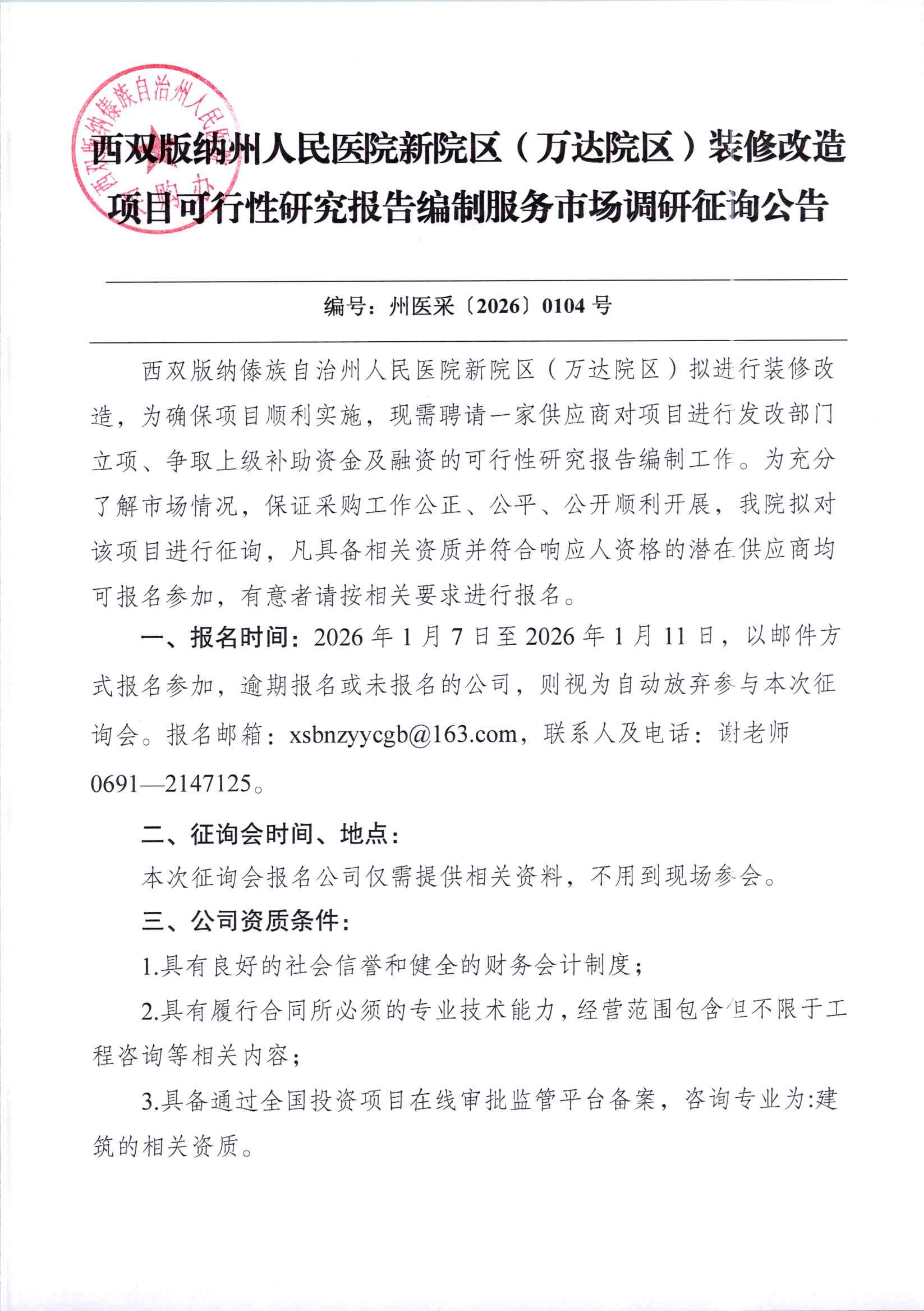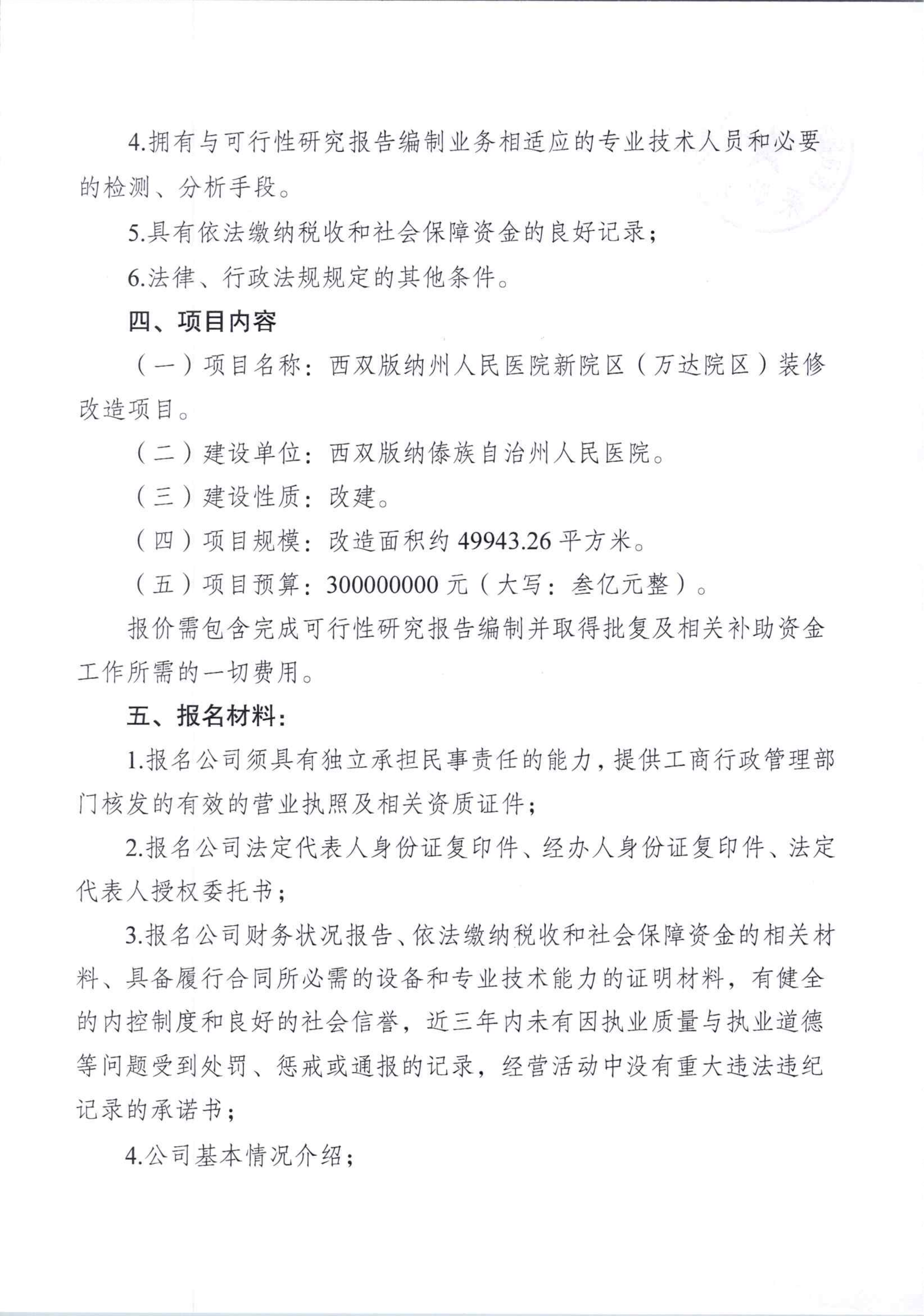 西双版纳傣族自治州人民医院新院区(万达院区)装修改造项目可行性研究报告编制服务市场调研征询公告