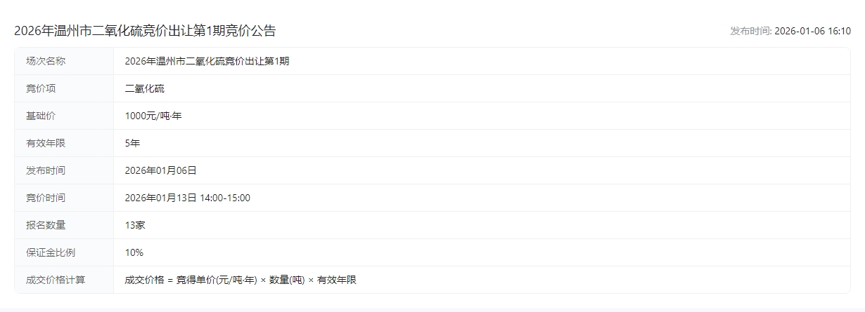 2026年温州市二氧化硫竞价出让第1期竞价公告