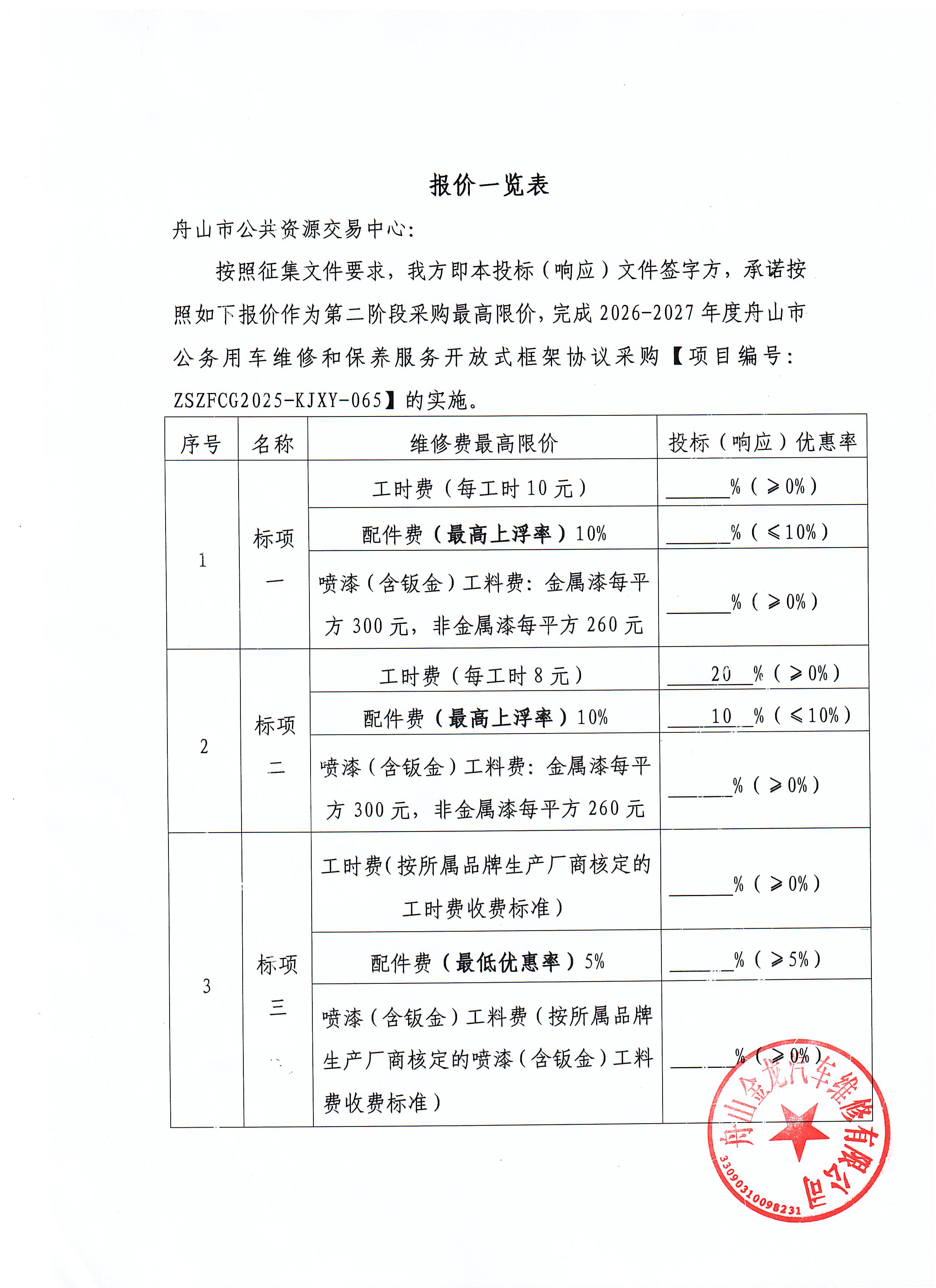 舟山金龙汽车维修有限公司入围2026-2027年度舟山市公务用车维修和保养服务开放式框架协议采购项目的结果公告