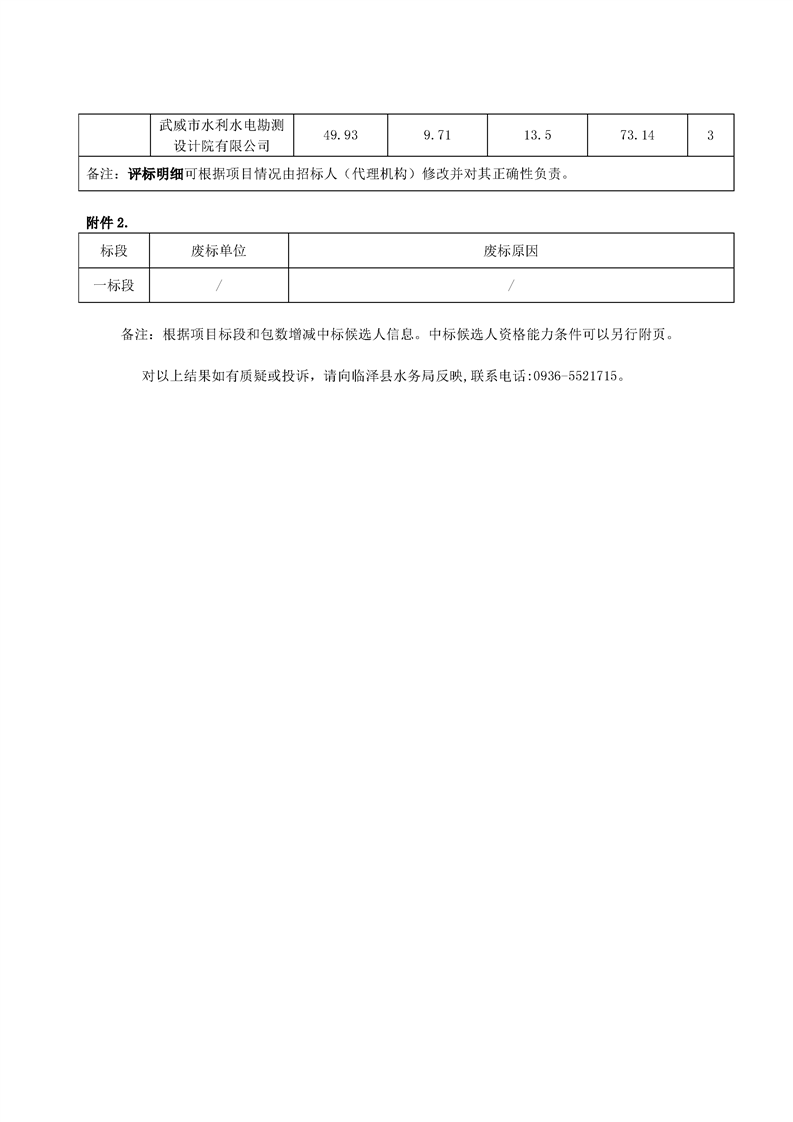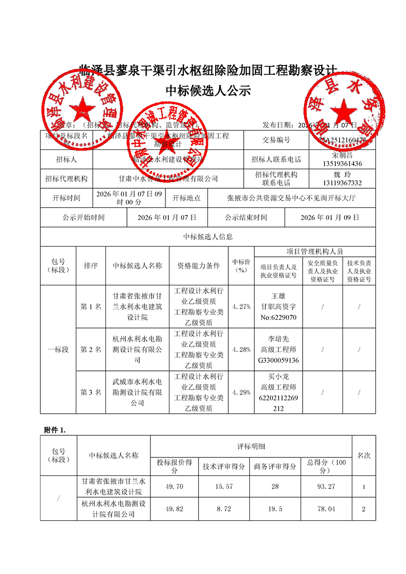 [市本级]临泽县蓼泉干渠引水枢纽除险加固工程勘察设计中标候选人公示交易结果公示