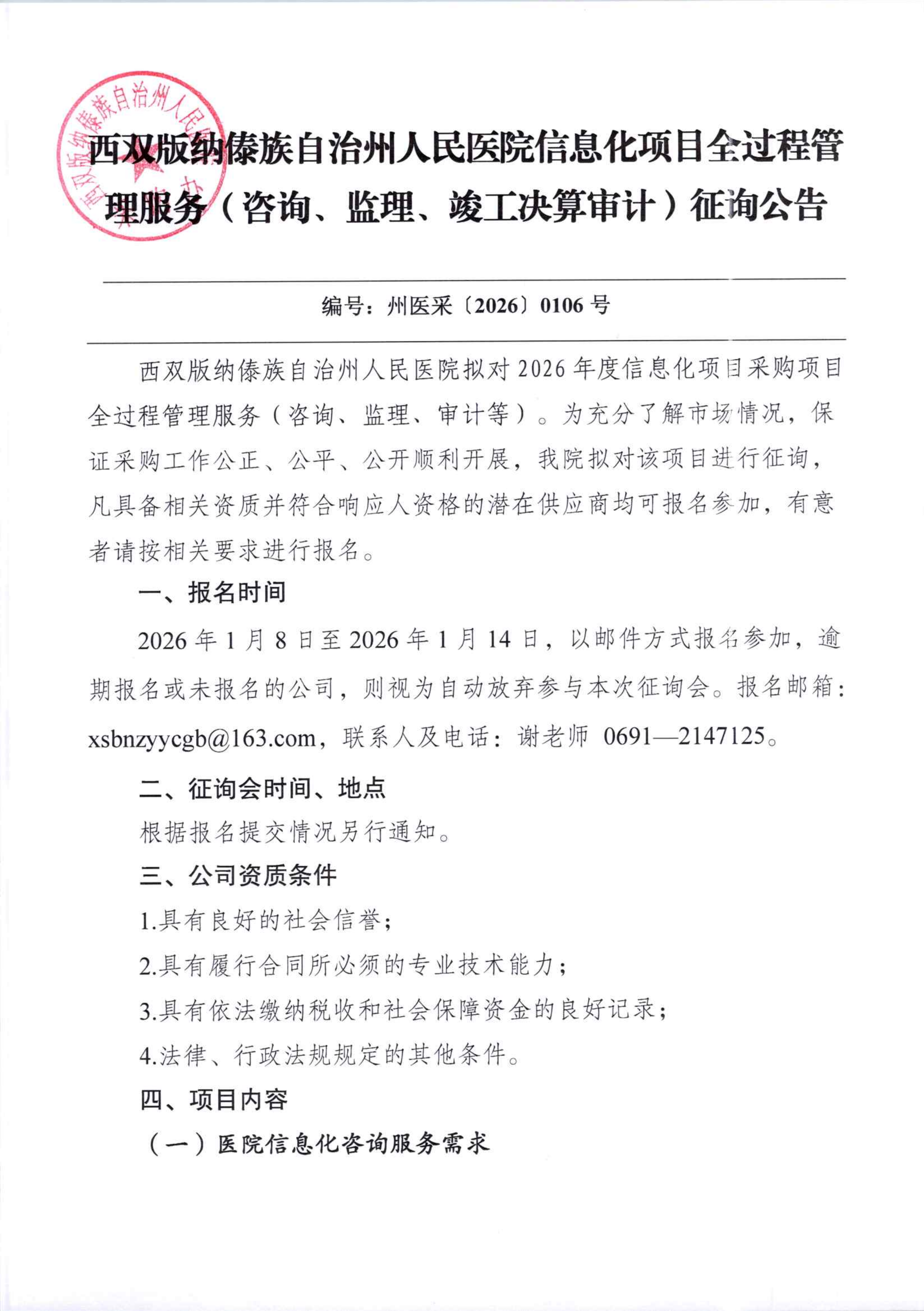 西双版纳傣族自治州人民医院信息化项目全过程管理服务(咨询、监理、竣工决算审计)征询公告