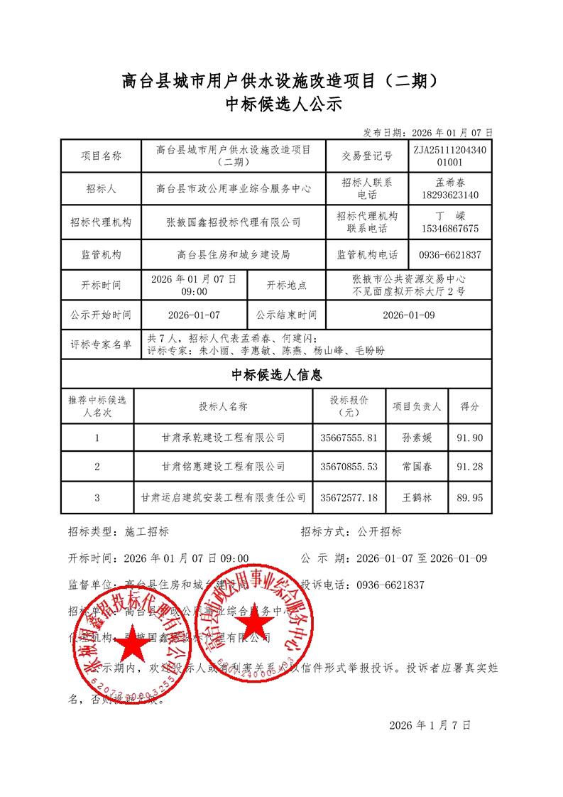 [市本级]高台县城市用户供水设施改造项目(二期)中标候选人公示