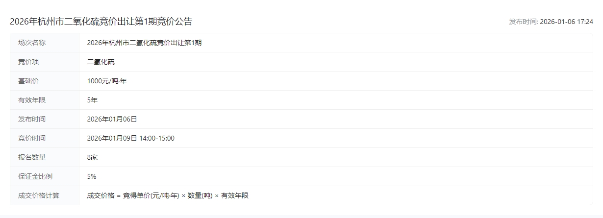 2026年杭州市二氧化硫竞价出让第1期竞价公告