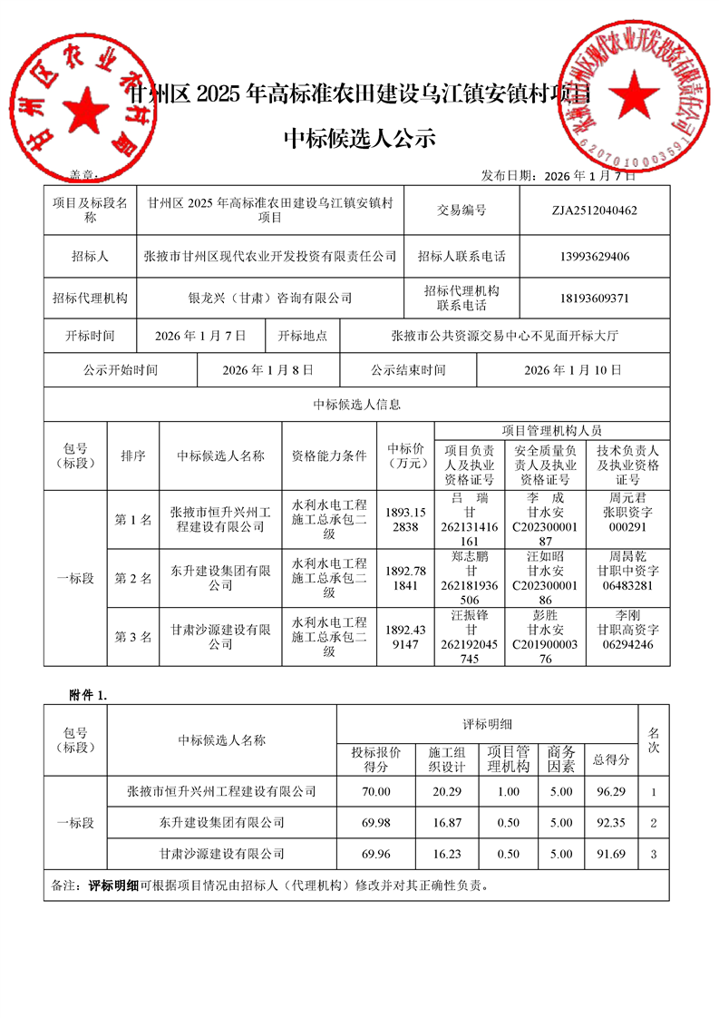 [市本级]甘州区2025年高标准农田建设乌江镇安镇村项目中标候选人公示