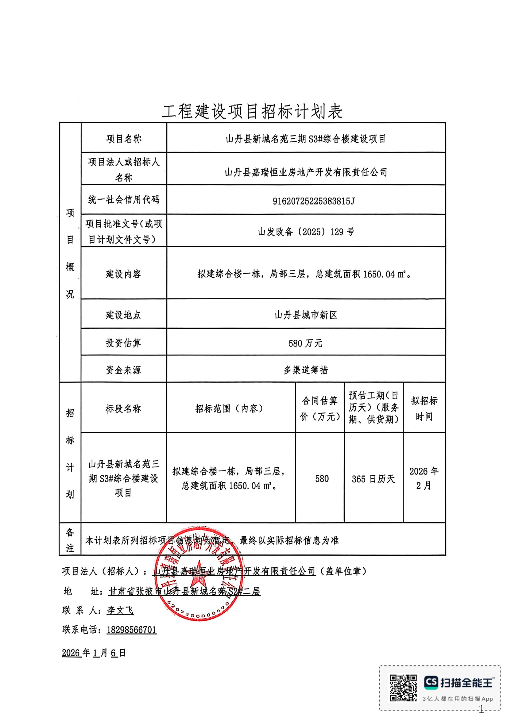 山丹县新城名苑三期S3#综合楼建设项目招标计划