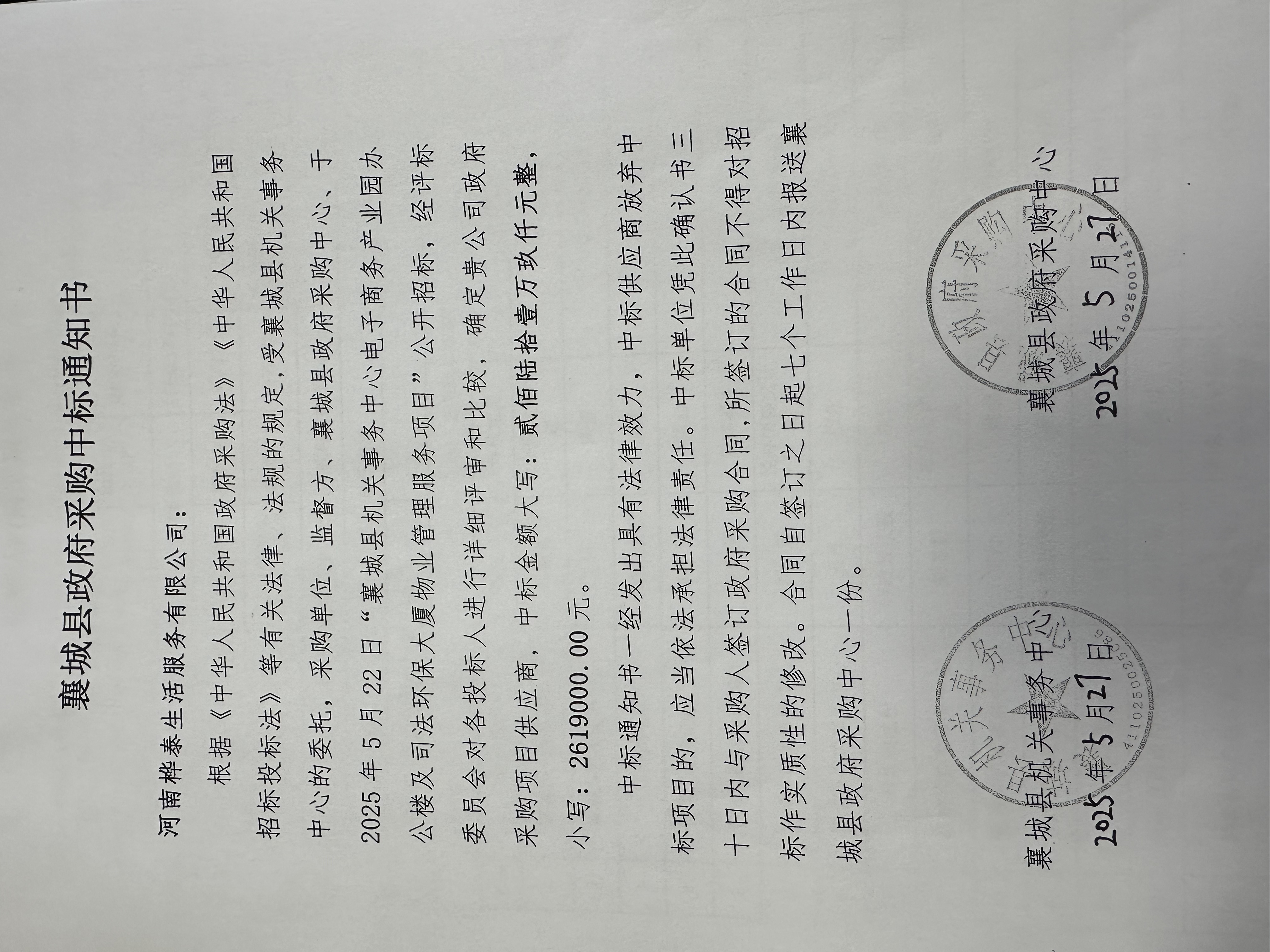 | 二、合同名称:襄城县机关事务中心电子商务产业园办公楼及司法环保大厦物业管理服务项目 | ||||||||||||