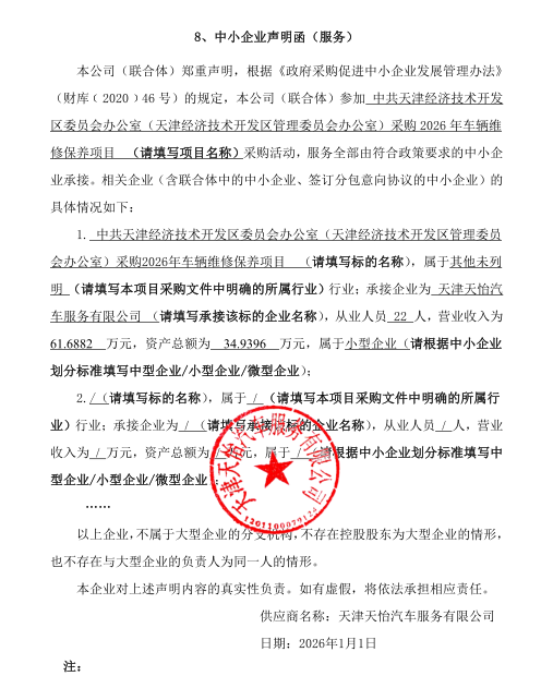 受中共天津经济技术开发区委员会办公室(天津经济技术开发区管理委员会办公室)委托,天津市滨海新区政府采购中心以竞争性磋商方式,对中共天津经济技术开发区委员会办公室(天津经济技术开发区管理委员会办公室)采购****年车辆维修保养项目实施采购,现将成交结果公布如下: 一、项目名称和编号 *.项目名称:中共天津经济技术开发区委员会办公室(天津经济技术开发区管理委员会办公室)采购****年车辆维修保养项目 *.项目编号:**************** 二、成交信息 *.成交供应商名称:天津天怡汽车服务有限公司 *.成交供应商地址:天津经济技术开发区微山路**号 *.供应商评审报价、评审总得分及排序情况:见附件 *.主要成交标标的名称、规格型号、数量、单价、服务要求或者标的基本概况:车辆维修保养服务 三、磋商小组成员名单 陈文利、黄玮、刘红强(采购人代表) 四、项目联系人及联系方式 *.联系人:郭晓萌 *.联系电话:************ 五、采购人的名称、地址和联系方式 *.采购人名称:中共天津经济技术开发区委员会办公室(天津经济技术开发区管理委员会办公室) *.采购人地址:天津市滨海新区于家堡融义路****号宝信大厦 *.采购人联系电话:刘红强,************ 六、采购代理机构的名称、地址和联系方式 *.采购代理机构名称:天津市滨海新区政府采购中心 *.采购代理机构地址:天津市滨海新区营口道***号 *.采购代理机构联系方式:************ 七、质疑方式 参与本项目政府采购活动的供应商认为成交结果使自己的合法权益受到损害的,可以在成交结果公告期限届满之日起*个工作日内,以书面形式向采购人天津市滨海新区政府采购中心提出质疑,逾期不予受理。 八、采购人和评审专家推荐意见 无 九、本项目向成交供应商收取服务费*元。 十、成交结果公告期限 成交结果的公告期限为*个工作日。 十一、竞争性磋商文件公告:见附件