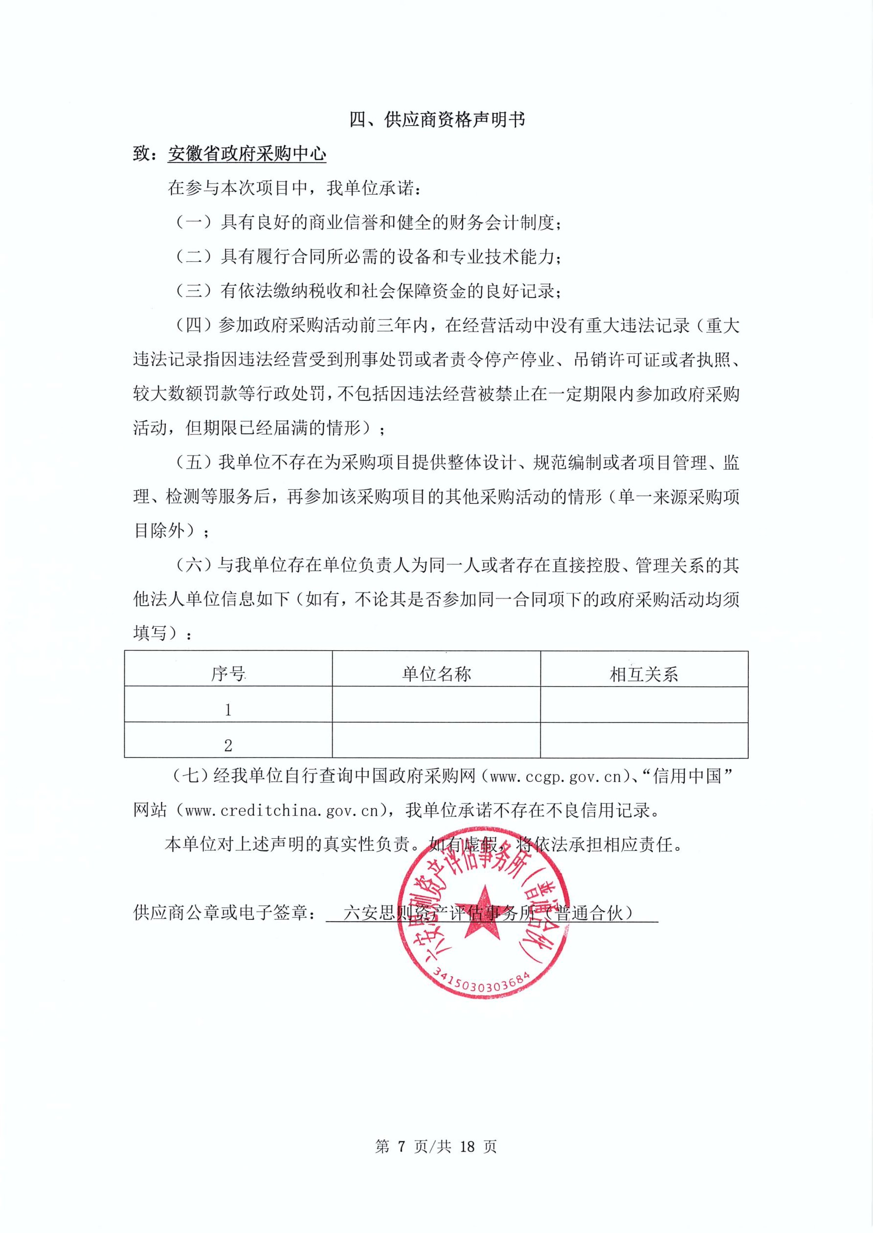 供应商资格声明书:思则评估*资产评估*申请文件*资格申明书.***
