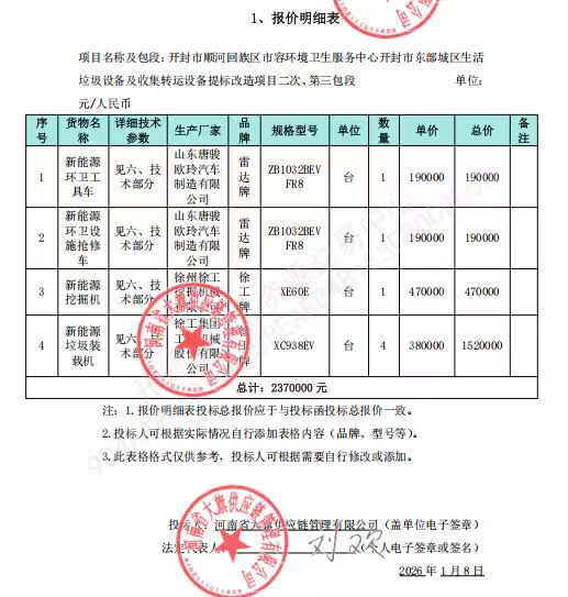 开封市顺河回族区市容环境卫生服务中心开封市东部城区生活垃圾设备及收集转运设备提标改造项目二次-第三包段中标公告