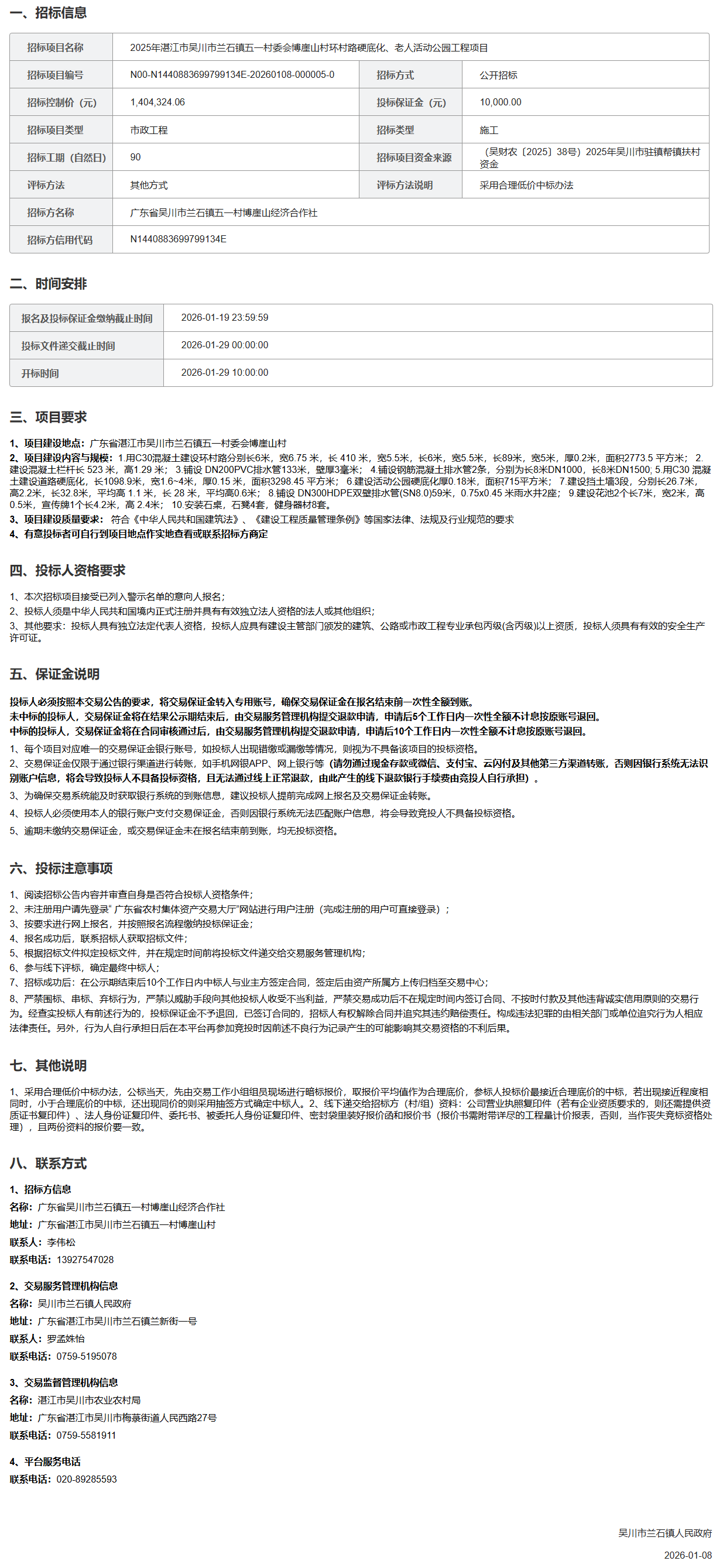 2025年湛江市吴川市兰石镇五一村委会博崖山村环村路硬底化、老人活动公园工程项目招标公告