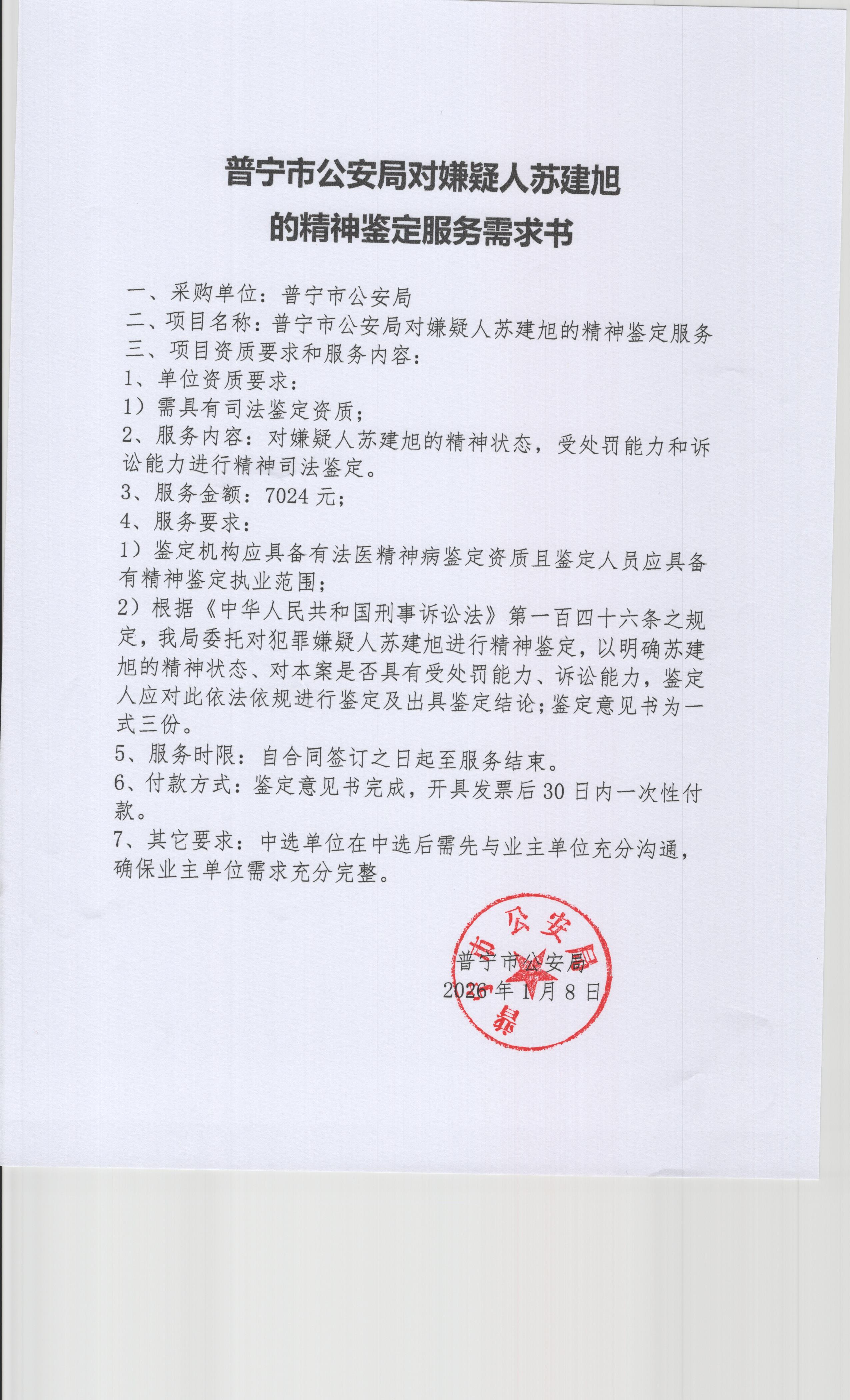 普宁市公安局对嫌疑人苏建旭的精神鉴定服务采购公告