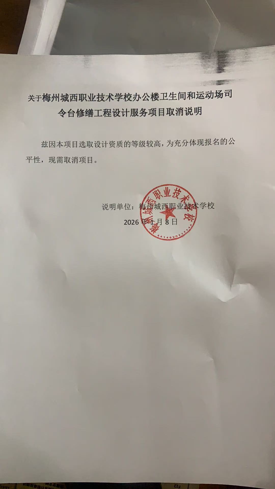 梅州城西职业技术学校办公楼卫生间和运动场司令台修缮工程设计服务采购失败项目公示