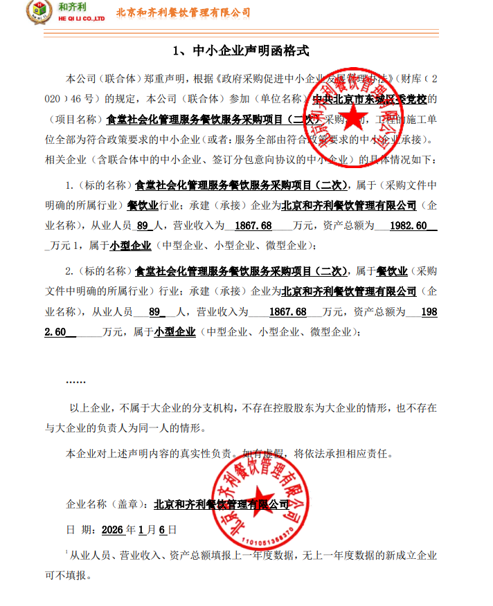 中标成交供应商名称:北京和齐利餐饮管理有限公司