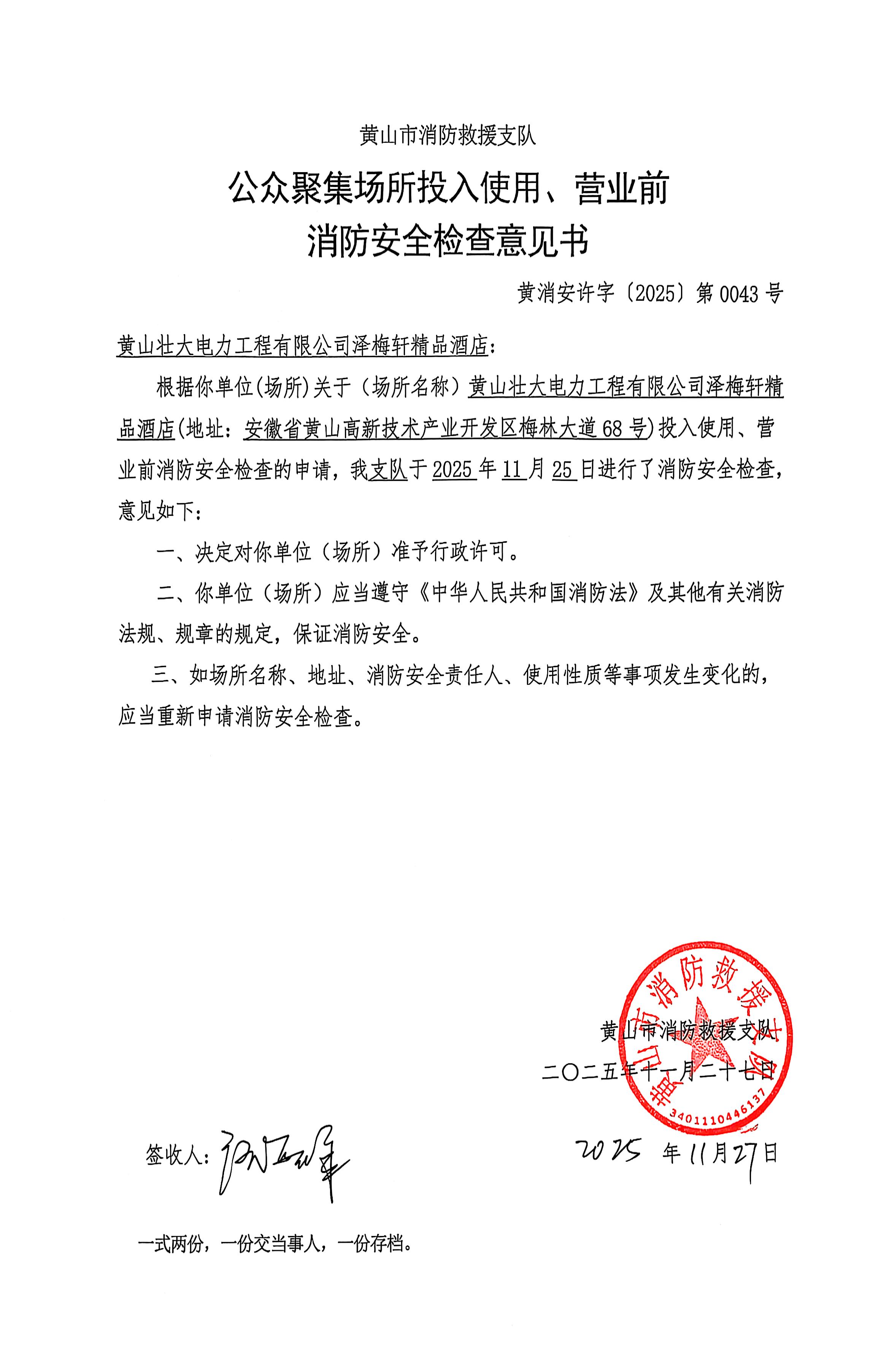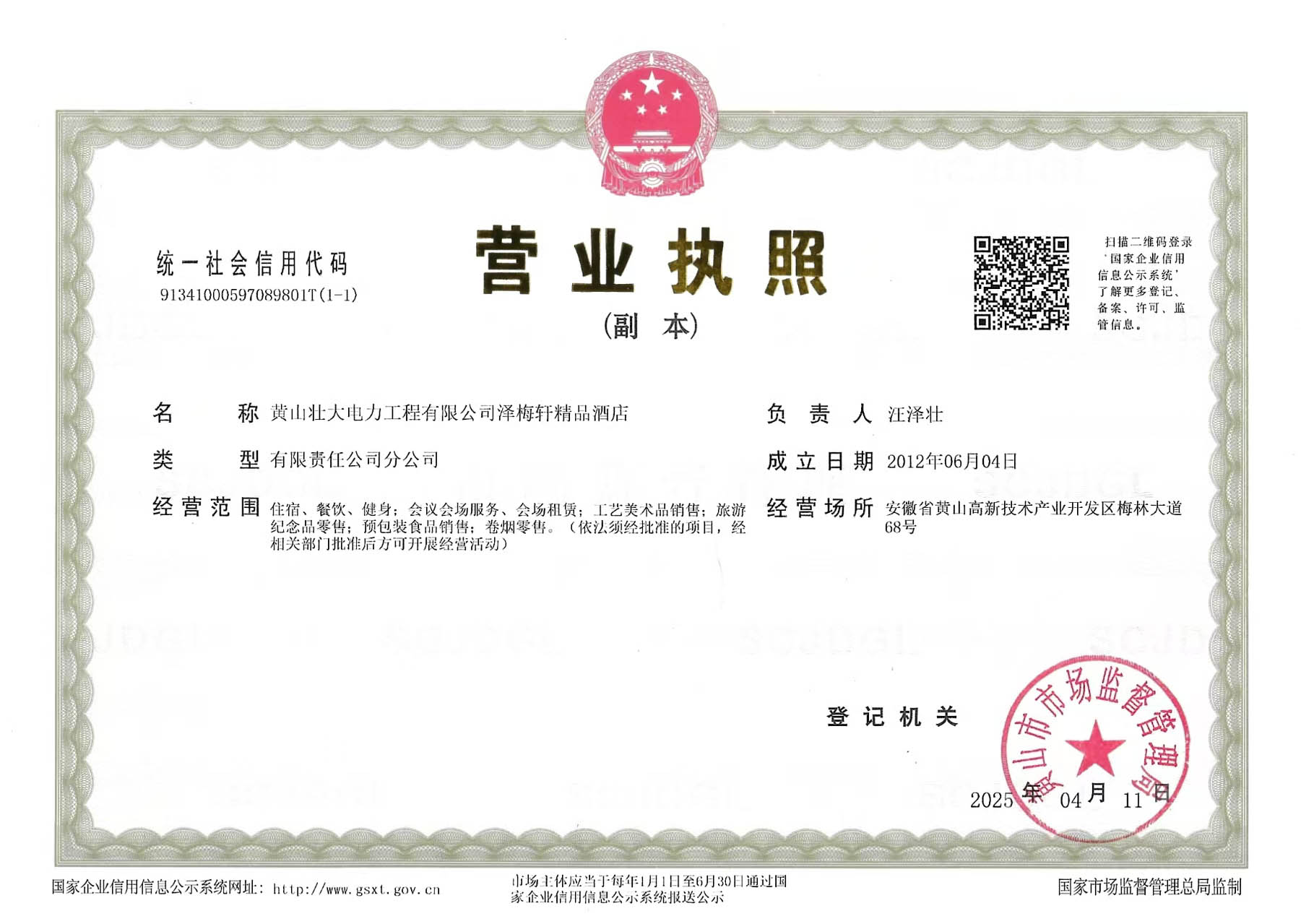 营业执照:黄山壮大电力工程有限公司泽梅轩酒店营业执照*.***