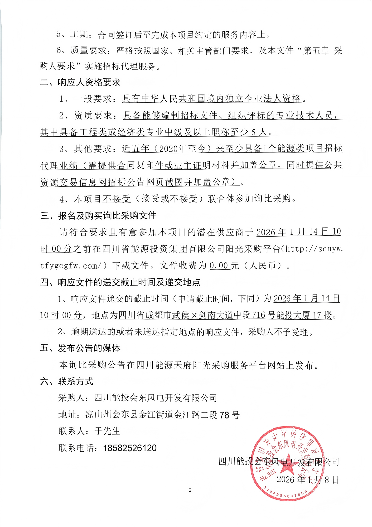 四川能投会东风电开发有限公司关于凉山会东堵格二期、小街二期、淌塘三期风电配套储能项目招标代理机构选聘的询比采购公告