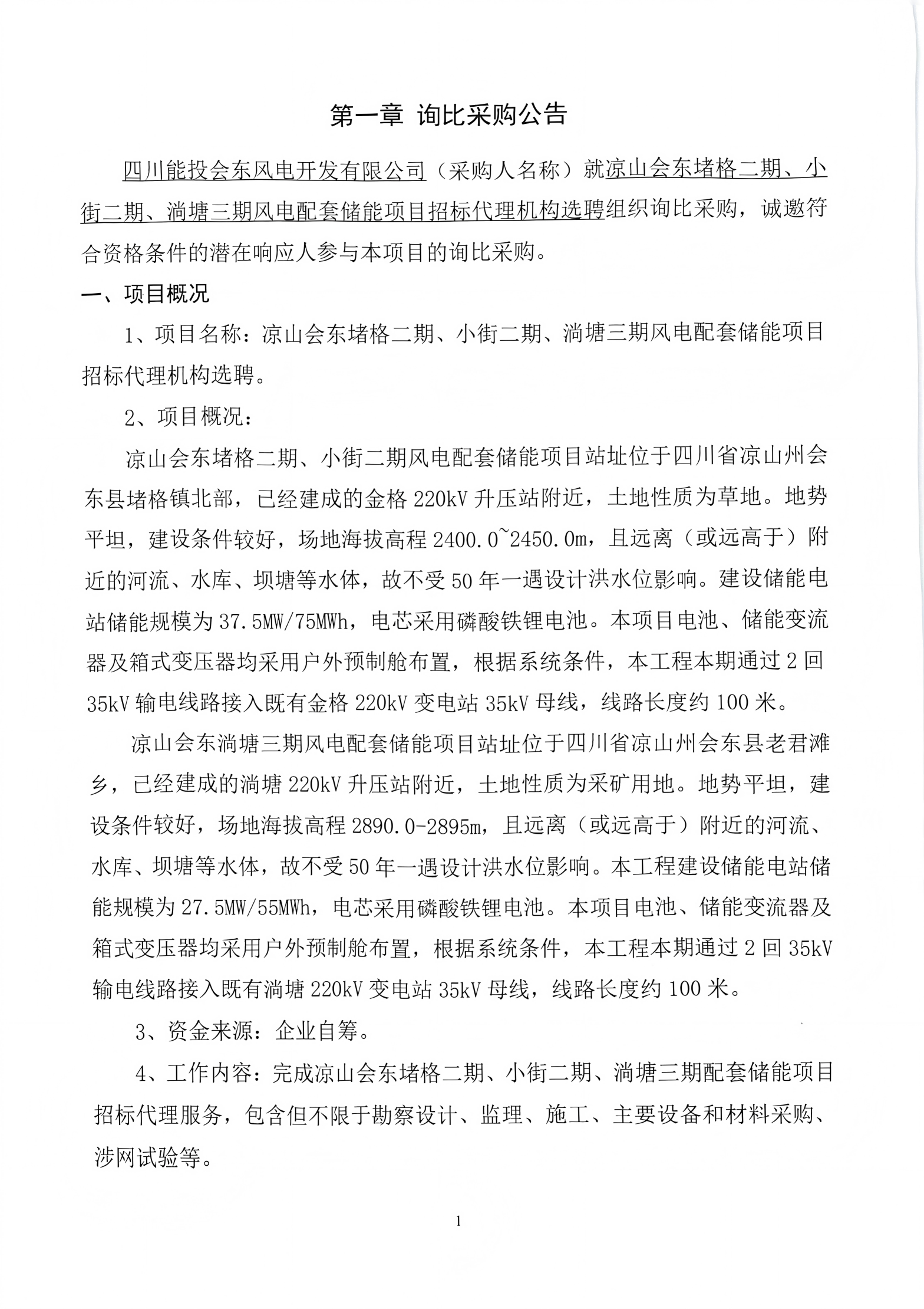 四川能投会东风电开发有限公司(采购人名称)就凉山会东堵格二期、小街二期、淌塘三期风电配套储能项目招标代理机构选聘组织询比采购,诚邀符合资格条件的潜在响应人参与本项目的询比采购。