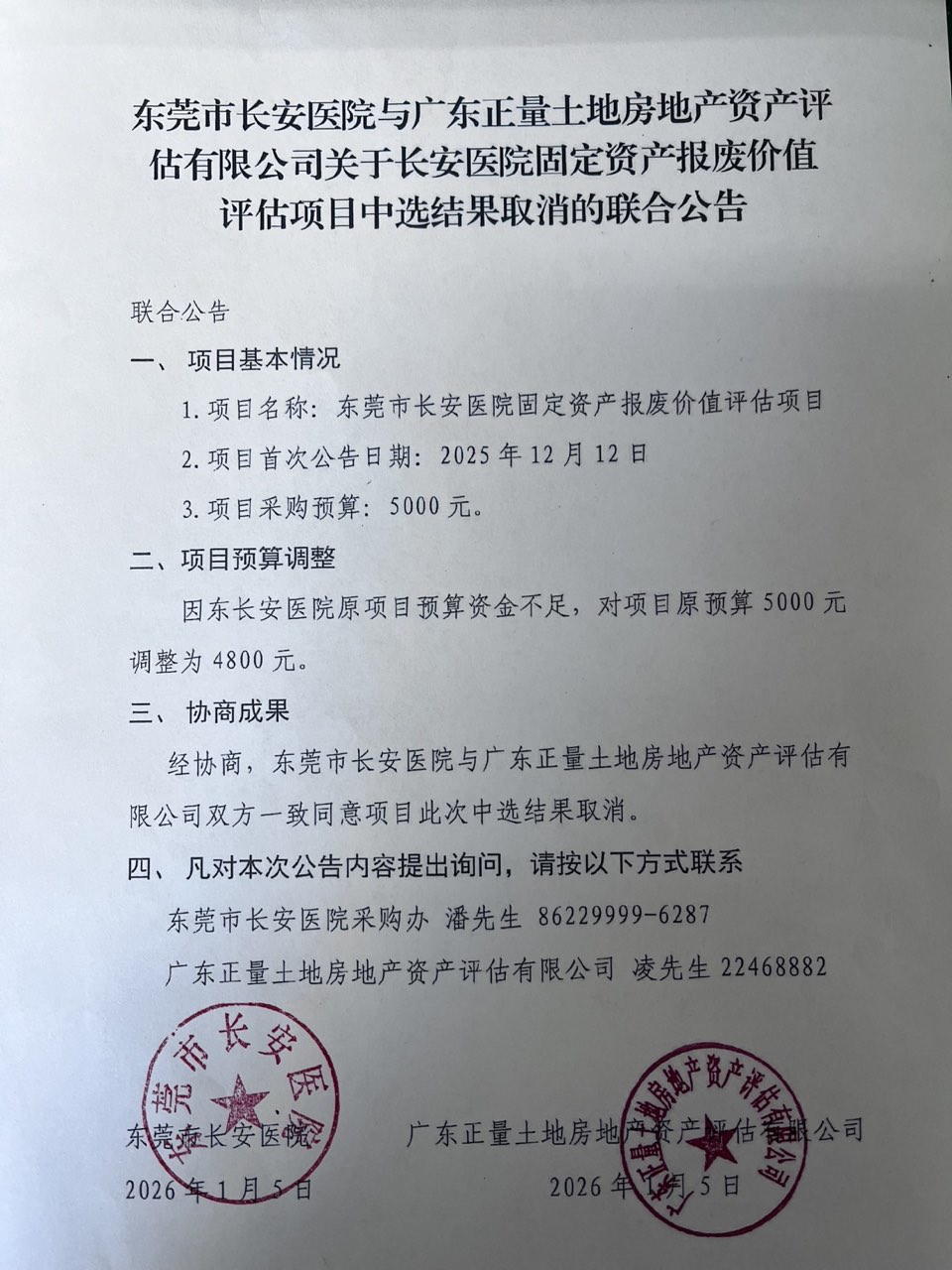 东莞市长安医院固定资产报废价值评估项目采购失败项目公示