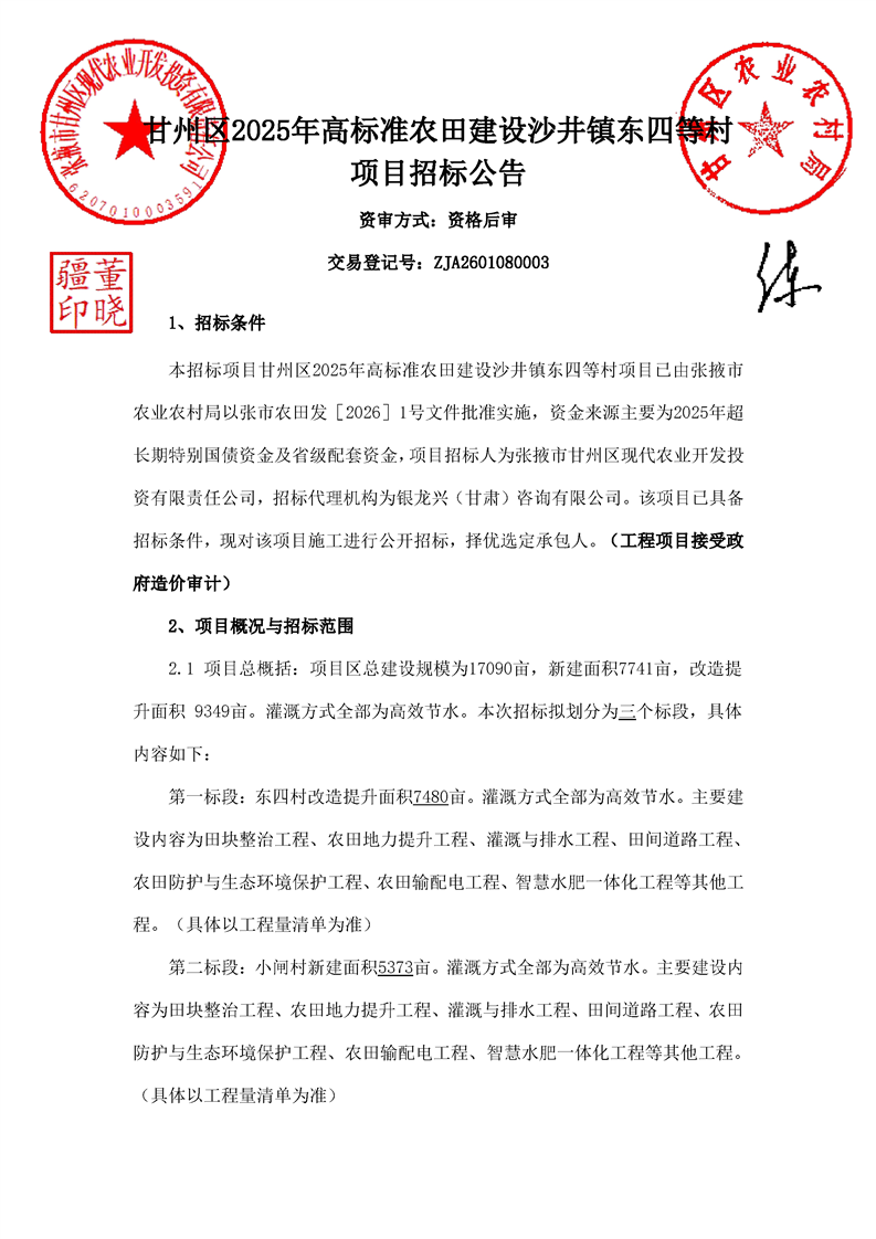 甘州区2025年高标准农田建设沙井镇东四等村项目招标/资审公告