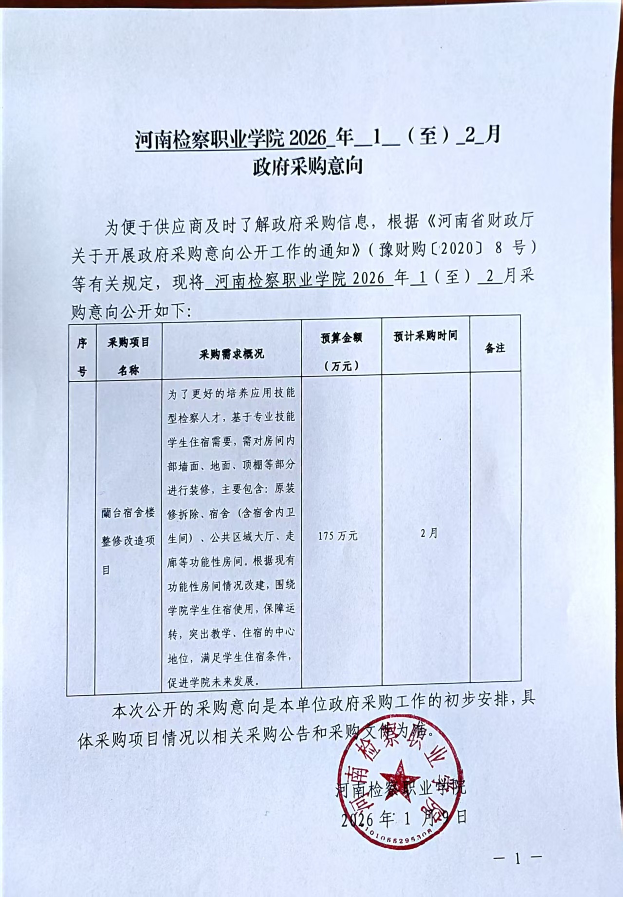 为便于供应商及时了解政府采购信息,根据《河南省财政厅关于开展政府采购意向公开工作的通知》(豫财购〔****〕*号)等有关规定,现将河南检察职业学院 ****年*(至)*月采购意向公开如下: |