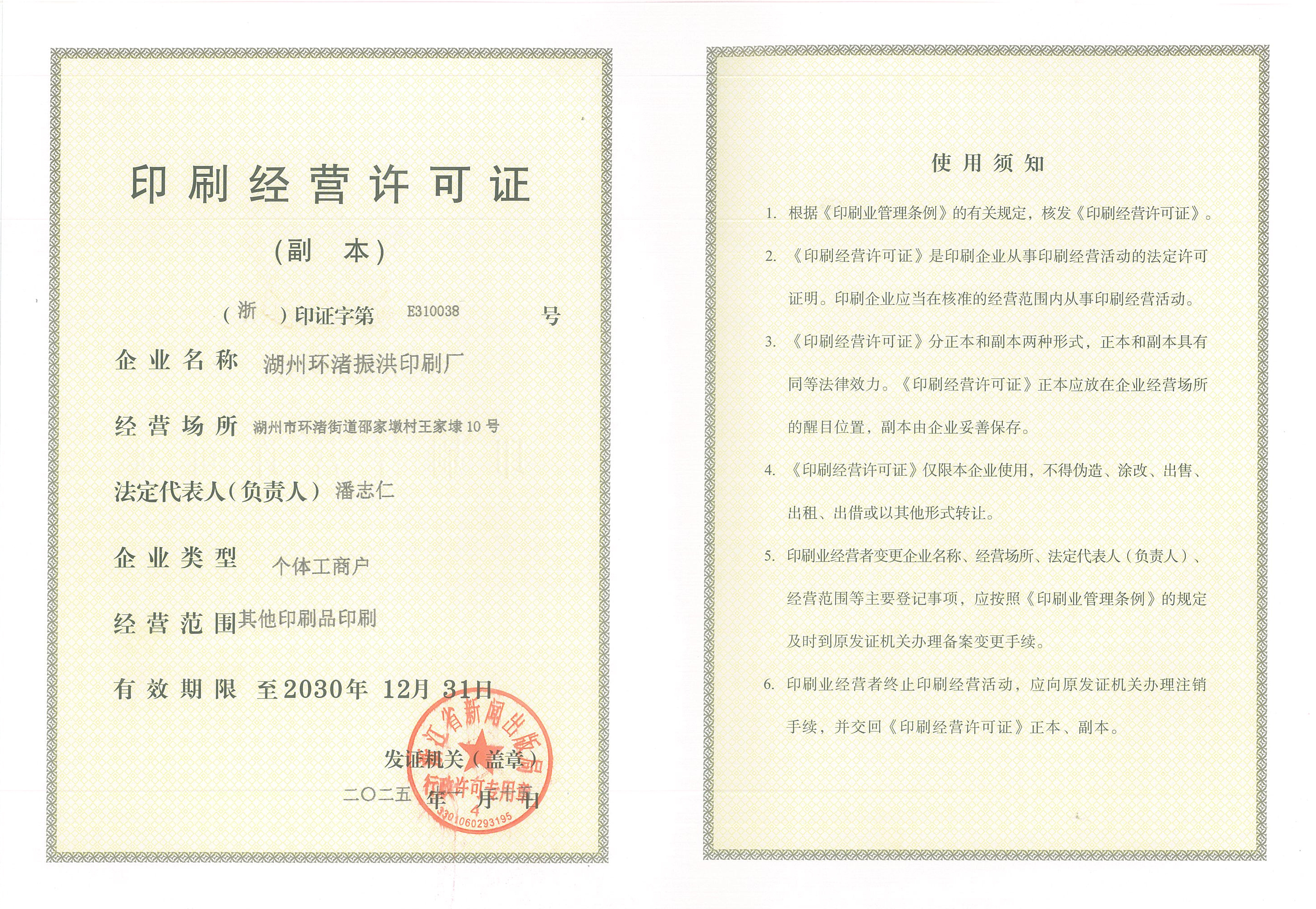 湖州环渚振洪印刷厂印刷服务(《印刷业管理条例》其他印刷品