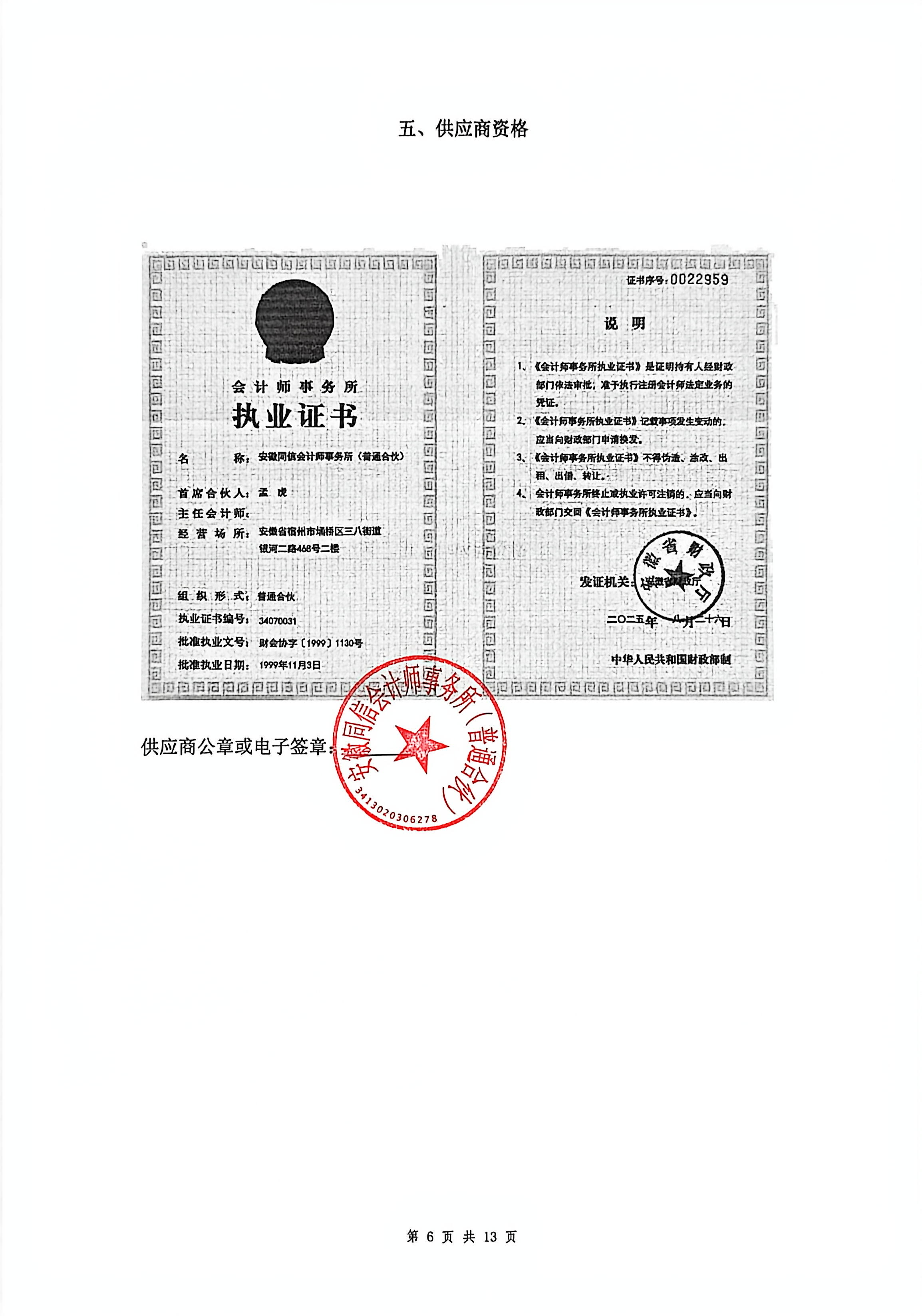 供应商名称:安徽同信会计师事务所(普通合伙)