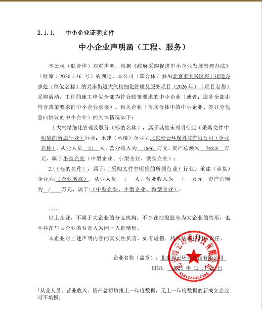 | 北京璟云环保科技有限公司 | * | ***.*万元 | ***.*万元 | 采购需求:对辖区大气污染进行分析汇总并形成长效机制、提供管控对策;开展常态化巡查和专业走航,对发现问题及时反馈、处置、整改,构建污染源全流程平台管理模式;对重点区域、第五立面开展精细化清扫保洁,对辖区道路开展除降尘作业,并在特殊时期、特殊天气配合增加作业频次等。预算金额:***万元。合同履行期限:一年。 |
