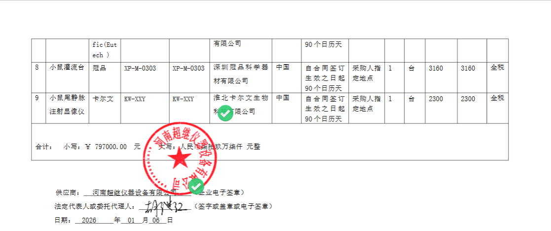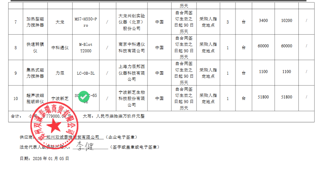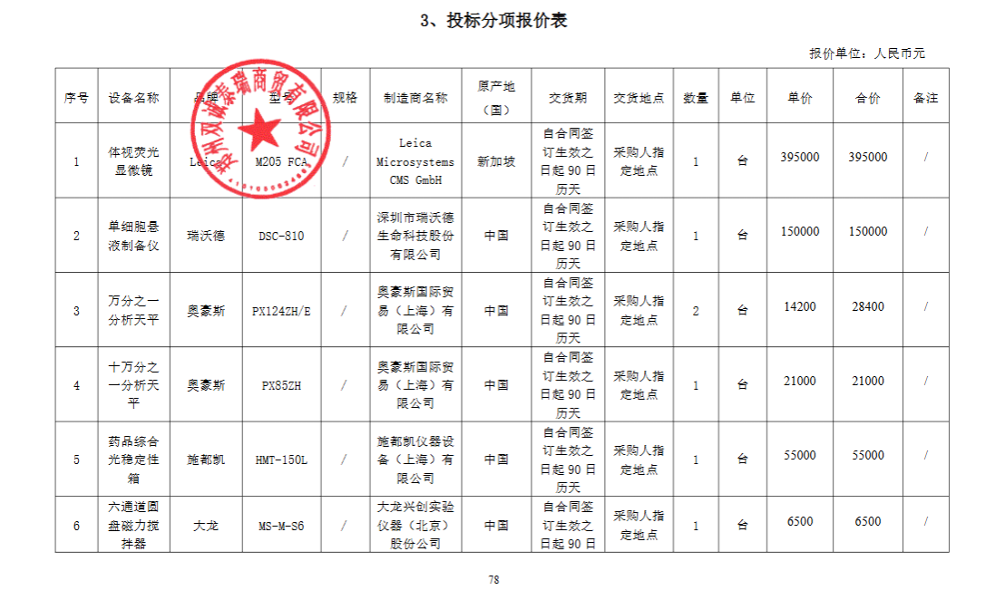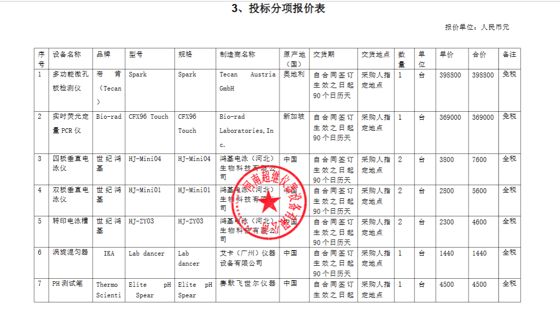 | *.*采购内容:*包:多功能微孔板检测仪、实时荧光定量***仪、四板垂直电泳仪、双板垂直电泳仪、转印电泳槽、涡旋混匀器、**测试笔、小鼠灌流台、小鼠尾静脉注射显像仪。*包:体视荧光显微镜、单细胞悬液制备仪、万分之一分析天平、十万分之一分析天平、药品综合光稳定性箱、六通道圆盘磁力搅拌器、加热型磁力搅拌器、快速转膜仪、集热式磁力搅拌器、超声波细胞破碎仪。 *.*交货期:自合同签订生效之日起**个日历天; *.*交货地点:采购人指定地点; *.*质量标准:合格,符合国家、行业规定的规范标准; *.*质量保证期:自验收合格之日起国产设备质量保证期*年,进口设备质量保证期*年。 *.*合同履行期限:签订合同之日至质保期满 | |||||||||||||||||||||||||||||||||||||||||||||||||||||||