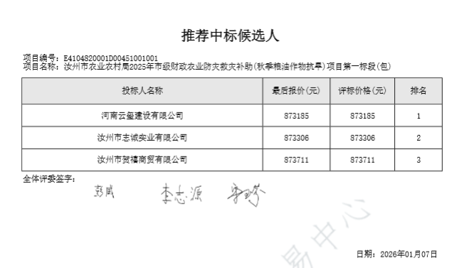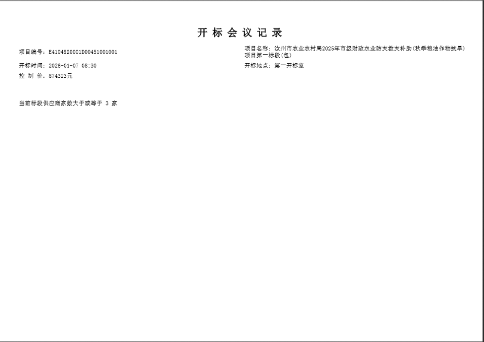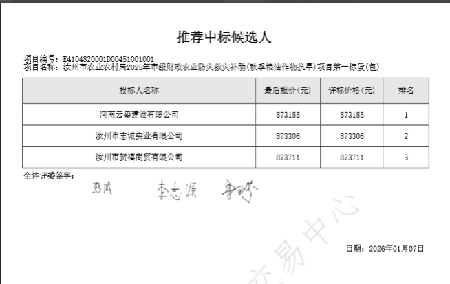 汝州市农业农村局2025年市级财政农业防灾救灾补助(秋季粮油作物抗旱)项目-成交公告