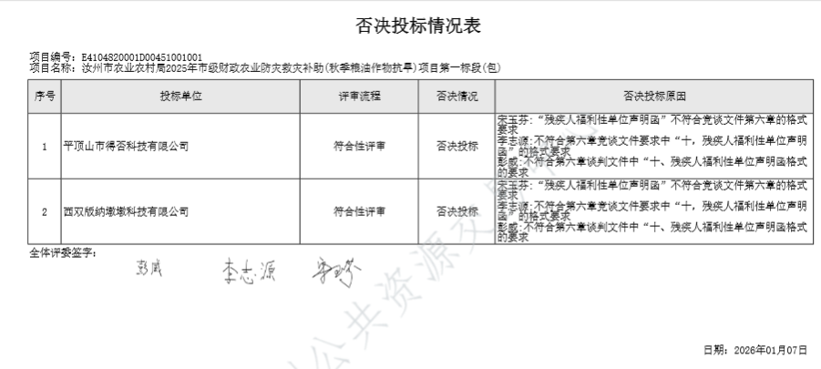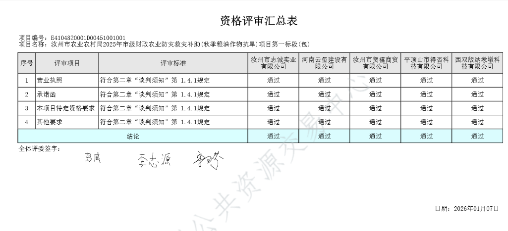 | *.开标记录表【详见附件*】;*.资格审查表【详见附件*】;*.符合性审查表【详见附件*】;*.谈判小组对所有响应人响应文件的总分排序【详见附件*】;*.各谈判小组成员对所有响应人响应文件的分项评分明细【详见附件*】;*. 响应人响应文件被否决原因【详见附件*】;*.被推荐响应人名单及理由【详见附件*】;*.根据评审结果、成交结果公告,按照国家有关规定,确定河南云玺建设有限公司为成交供应商,其他供应商未成交;*.受理投诉监督管理部门:汝州市财政局 联系电话:************ ************ 邮箱地址:********@***.*** 联系地址:汝州市望嵩中路 *** 号;**.各供应商对成交结果有异议,请按中华人民共和国财政部令第**号《政府采购质疑和投诉办法》的相关规定,在规定时间内,向采购人、采购代理机构、政府采购监督部门提出质疑、投诉等事宜。逾期未提交或未按照要求提交的质疑、投诉将不予受理。 | |||||||||||||||||||||||||||||||
