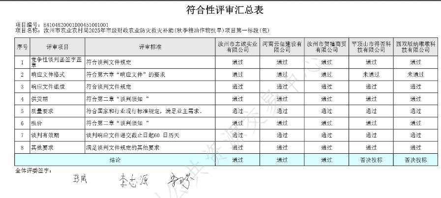 | *.开标记录表【详见附件*】;*.资格审查表【详见附件*】;*.符合性审查表【详见附件*】;*.谈判小组对所有响应人响应文件的总分排序【详见附件*】;*.各谈判小组成员对所有响应人响应文件的分项评分明细【详见附件*】;*. 响应人响应文件被否决原因【详见附件*】;*.被推荐响应人名单及理由【详见附件*】;*.根据评审结果、成交结果公告,按照国家有关规定,确定河南云玺建设有限公司为成交供应商,其他供应商未成交;*.受理投诉监督管理部门:汝州市财政局 联系电话:************ ************ 邮箱地址:********@***.*** 联系地址:汝州市望嵩中路 *** 号;**.各供应商对成交结果有异议,请按中华人民共和国财政部令第**号《政府采购质疑和投诉办法》的相关规定,在规定时间内,向采购人、采购代理机构、政府采购监督部门提出质疑、投诉等事宜。逾期未提交或未按照要求提交的质疑、投诉将不予受理。 | |||||||||||||||||||||||||||||||