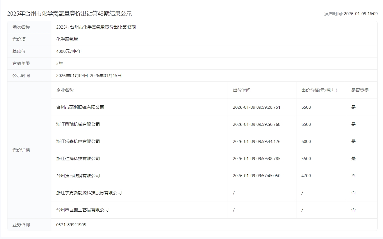 2025年台州市化学需氧量竞价