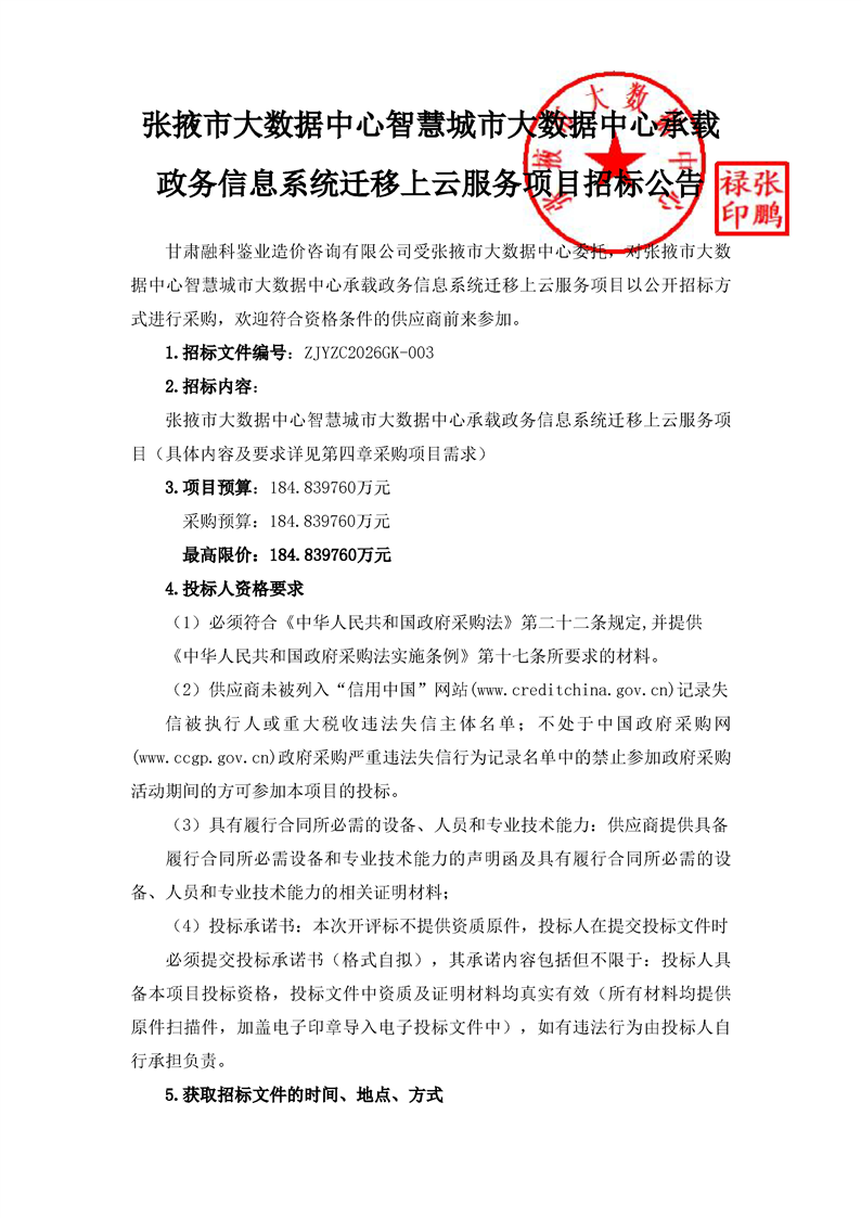 张掖市大数据中心智慧城市大数据中心承载政务信息系统迁移上云服务项目招标公告