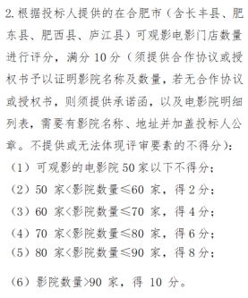 *.根据补疑*文件第二部分:招标文件澄清部分“电影兑换券使用范围 *.根据投标人提供的在合肥市(含长丰县、肥东县、肥西县、庐江县)可观影电影门店数量进行评分,满分**分(须提供合作协议或授权书予以证明影院名称及数量,若无合作协议或授权书,则须提供承诺函,以及电影院明细列表,需要有影院名称、地址并加盖投标人公章。不提供或无法体现评审要素的不得分)”